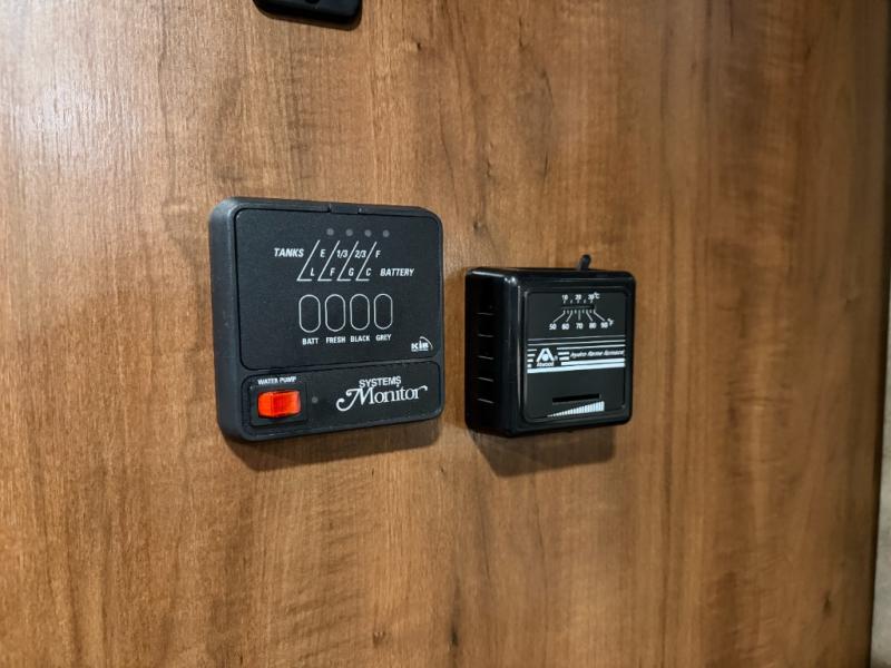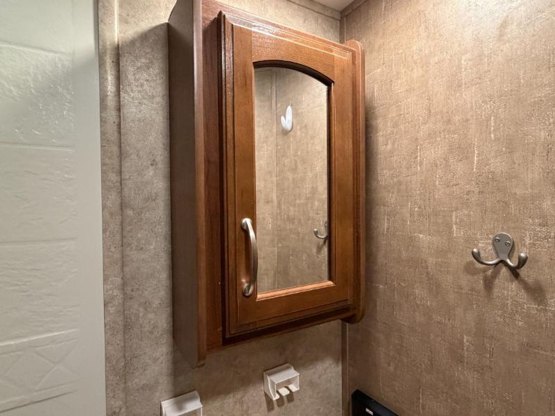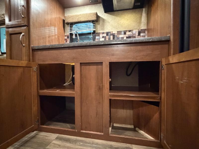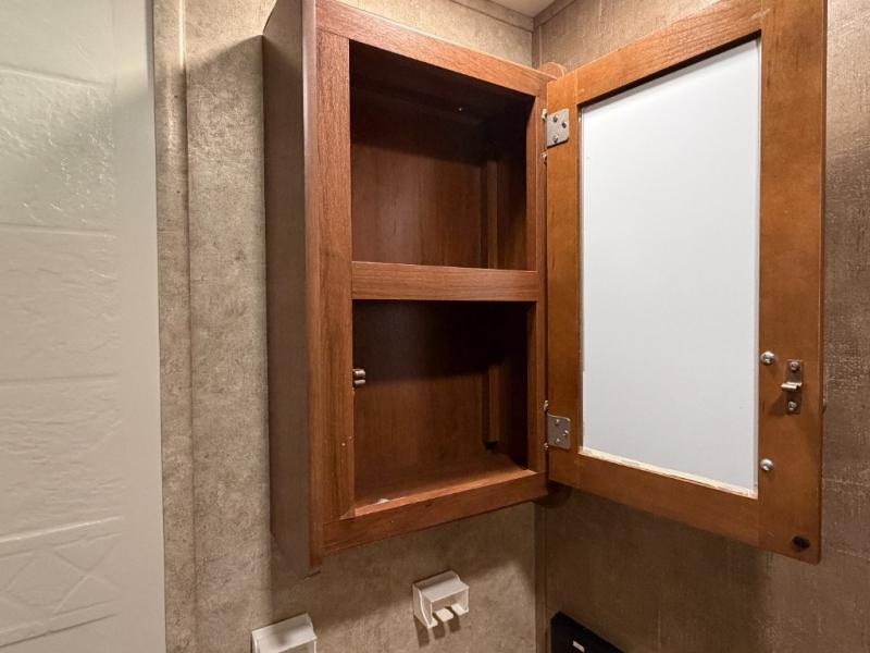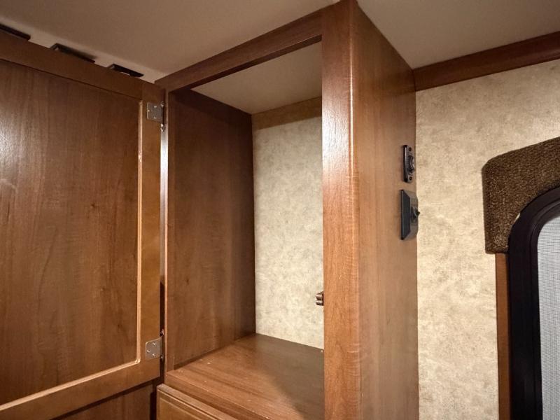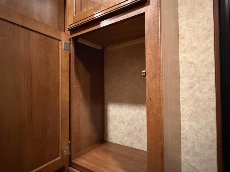 The front bed includes overhead cabinets and storage. The rear bed has an overhead shelf to place some of your gear.