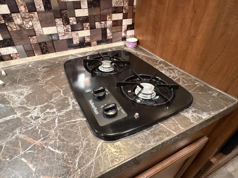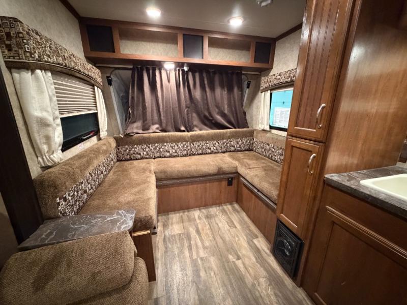 As you enter the expandable, to the right is a pantry, refrigerator with an overhead cabinet, two burner range, sink, and a wardrobe. A u-shaped dinette is along the front of the expandable before the front bed.