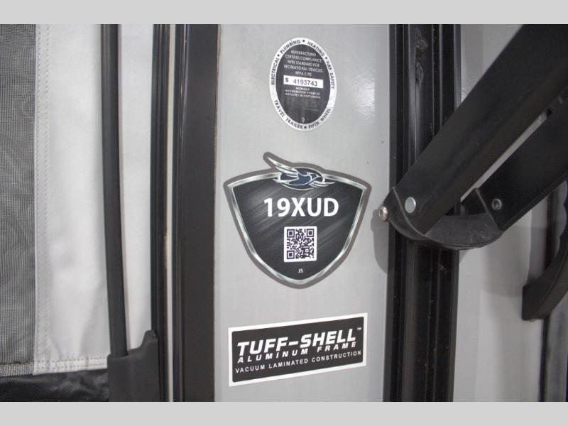 This Jay Feather 7 model 19XUD expandable by Jayco features a single slide, rear and front beds, a u-shape dinette, and sleeps 7!
