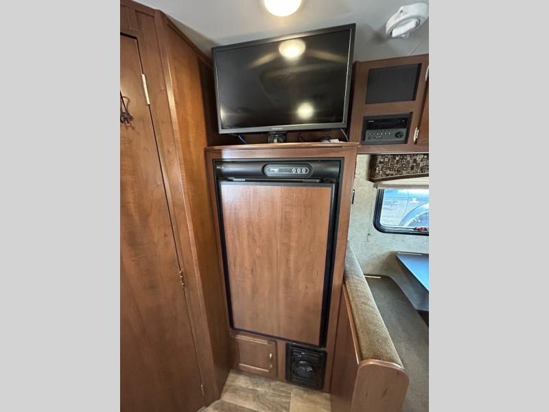 Along the opposite side of the expandable you will find a dinette with overhead storage, refrigerator, and a TV shelf.