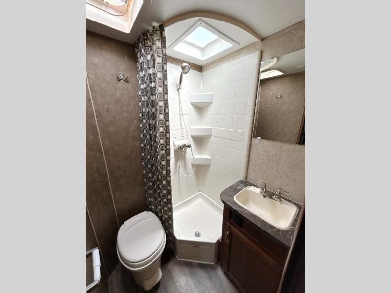 The bathroom is located in the rear. The bathroom has a toilet, corner shower, and a sink.