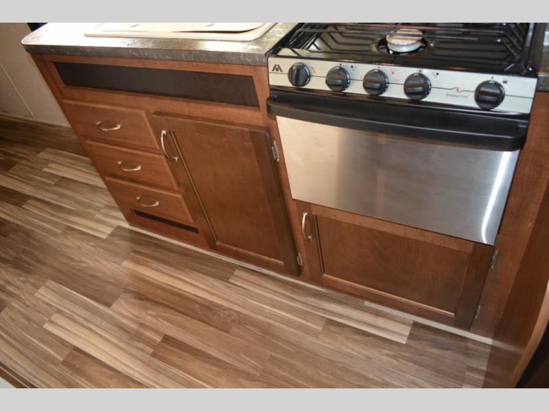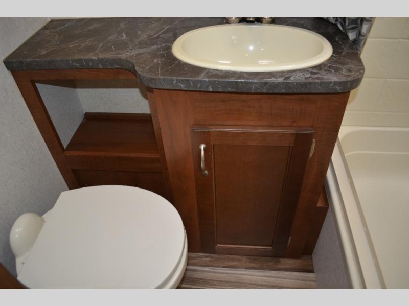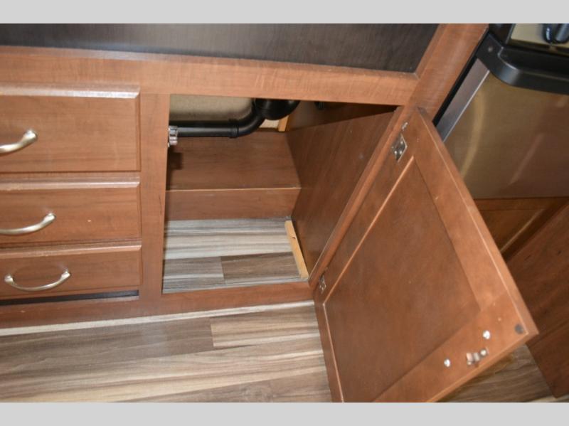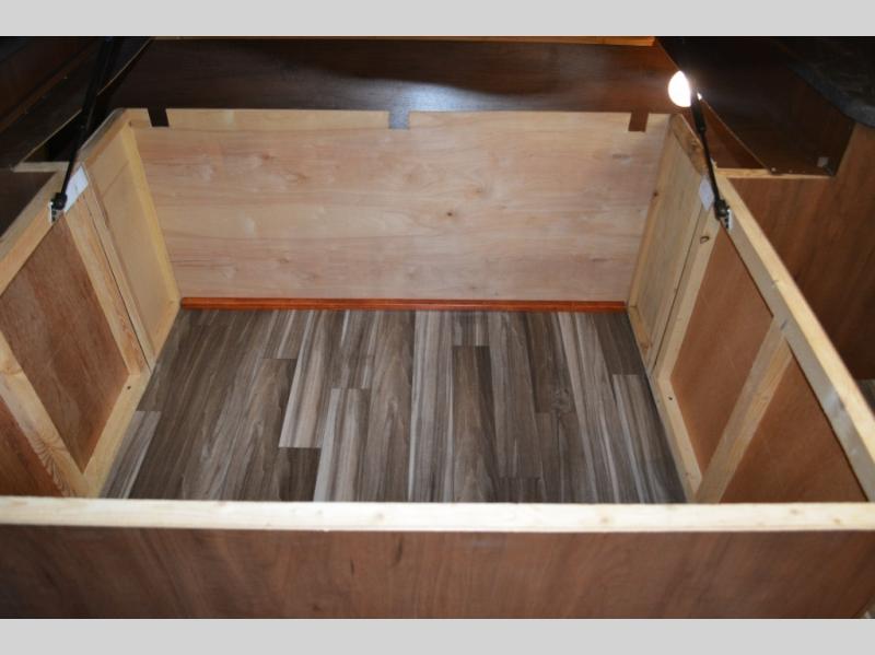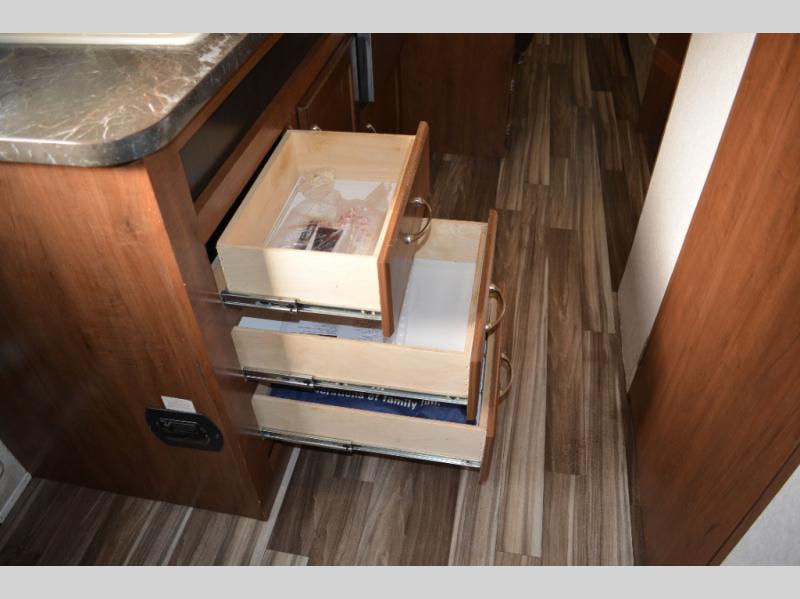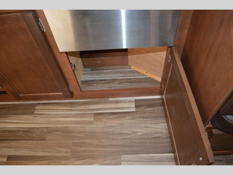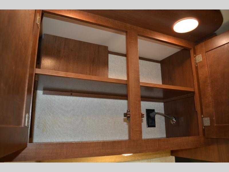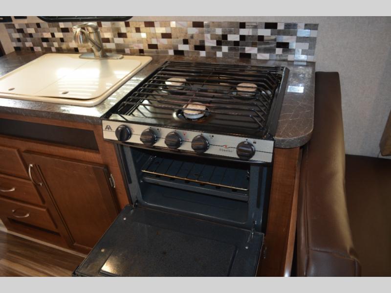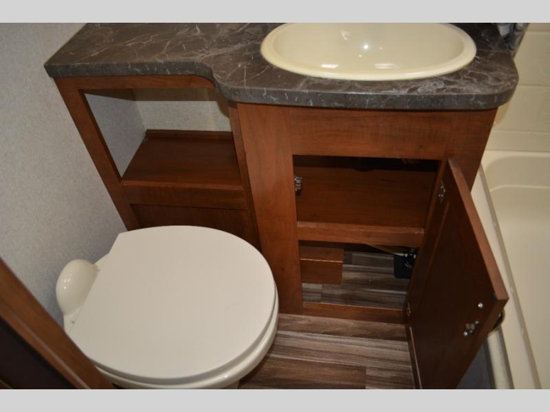 Enjoy meals at the dinette, and across from the dinette there is a sofa. Both the dinette and sofa feature an overhead cabinet, and both offer great seating options during the day, and at night these can be used for additional sleeping spots.