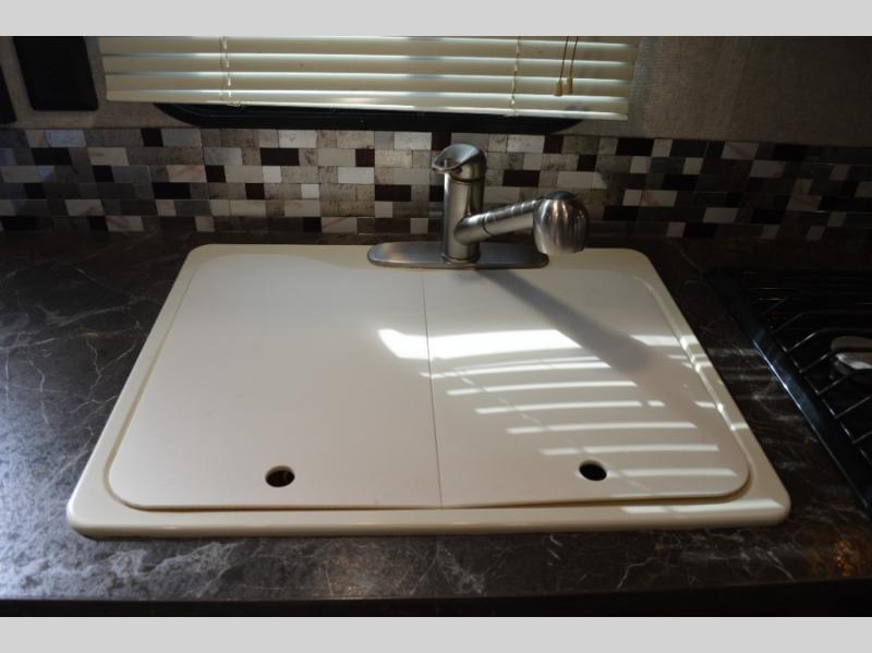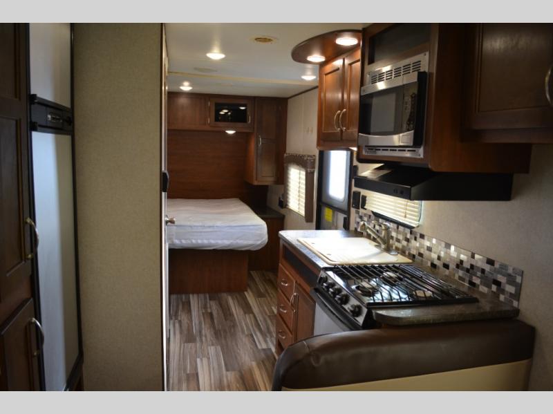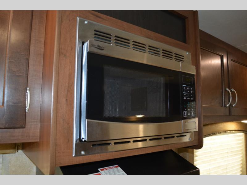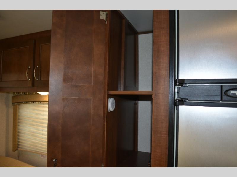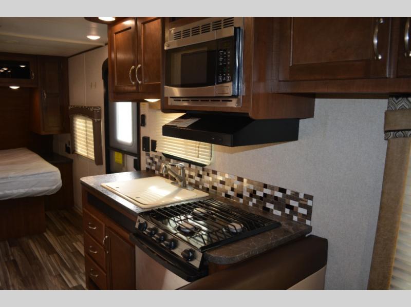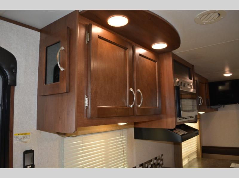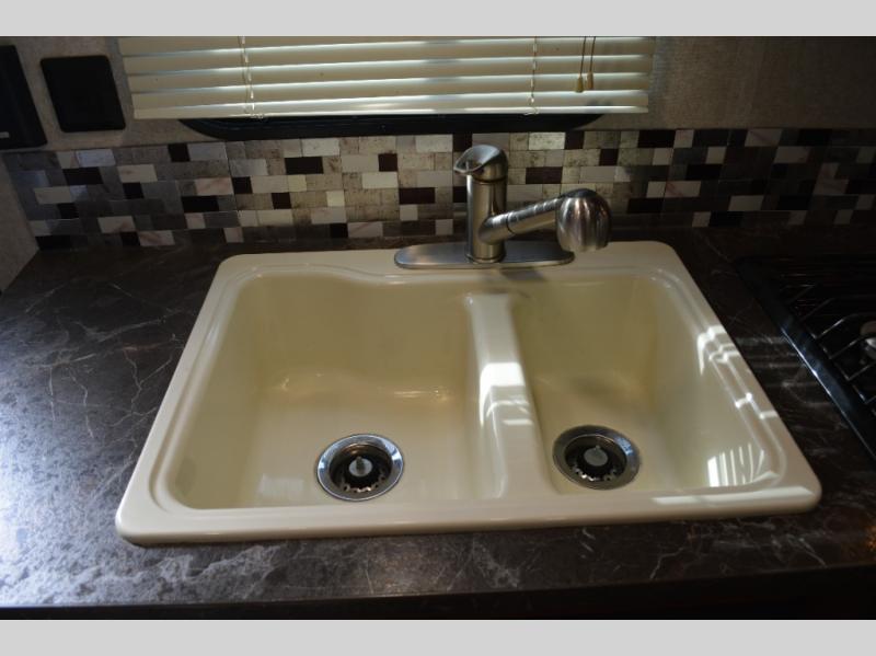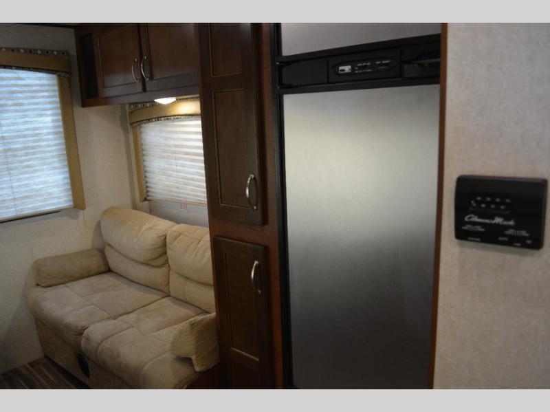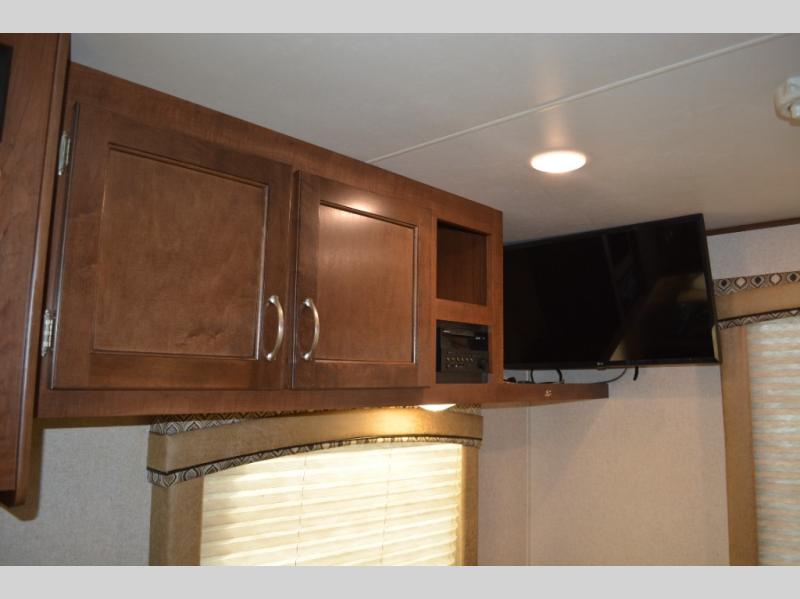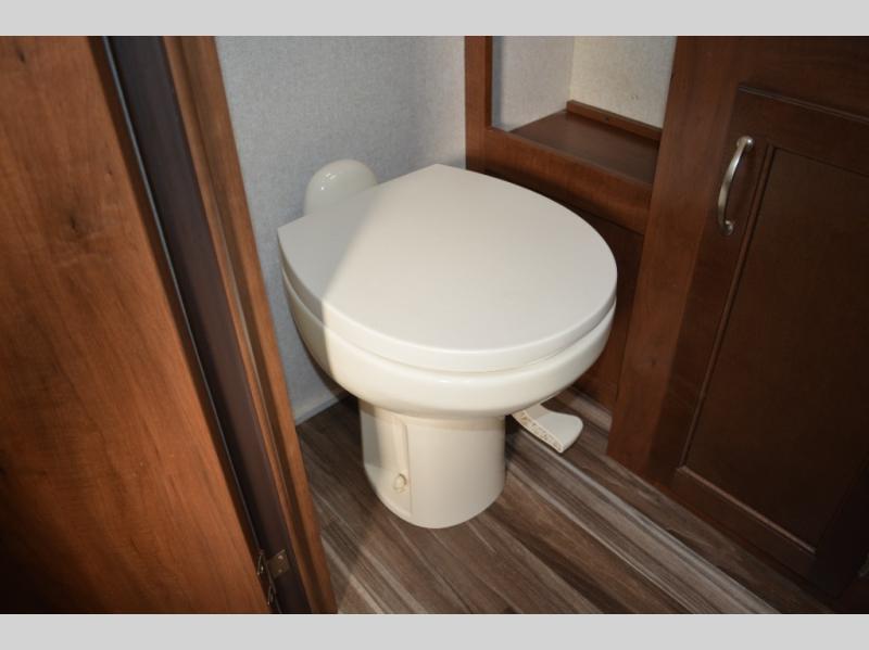 Enjoy meals at the dinette, and across from the dinette there is a sofa. Both the dinette and sofa feature an overhead cabinet, and both offer great seating options during the day, and at night these can be used for additional sleeping spots.