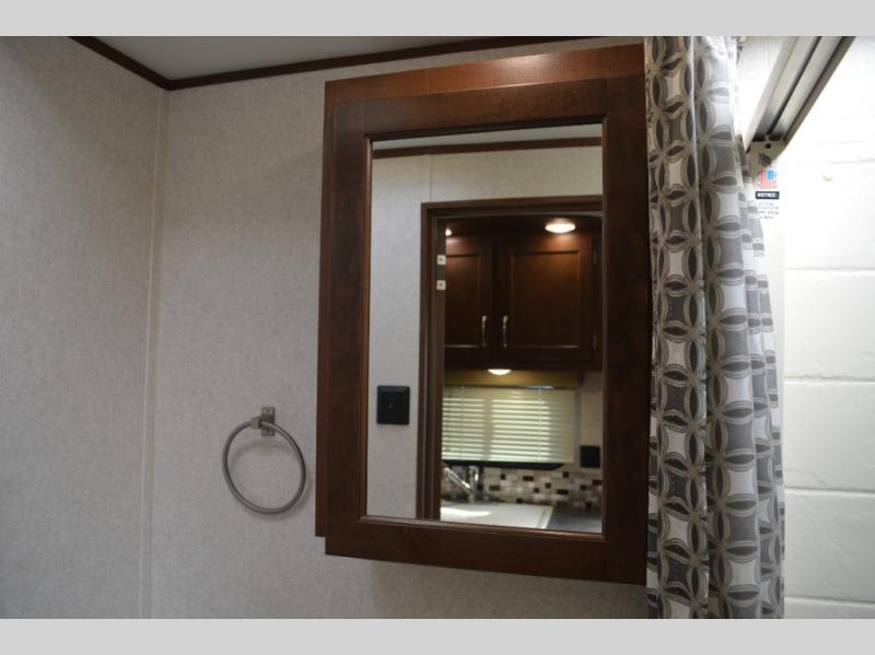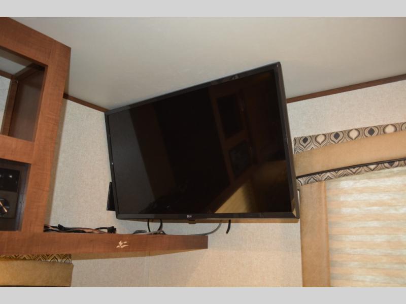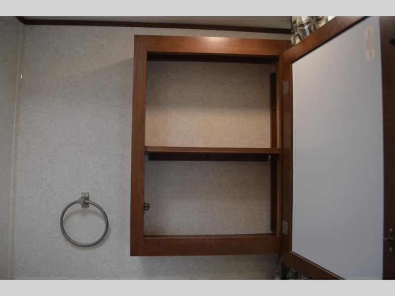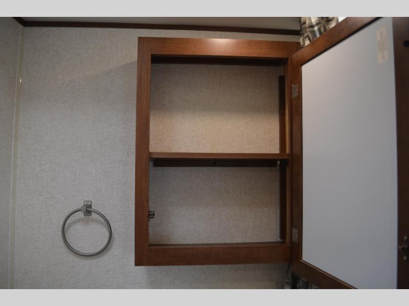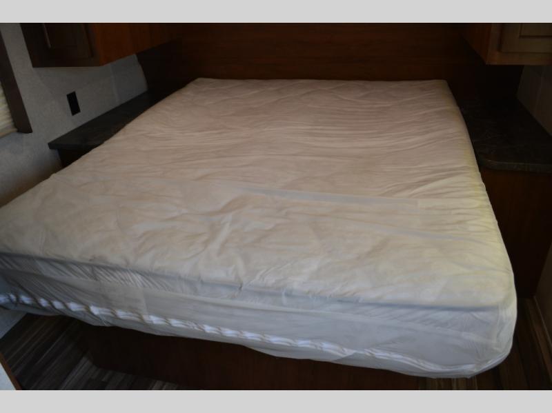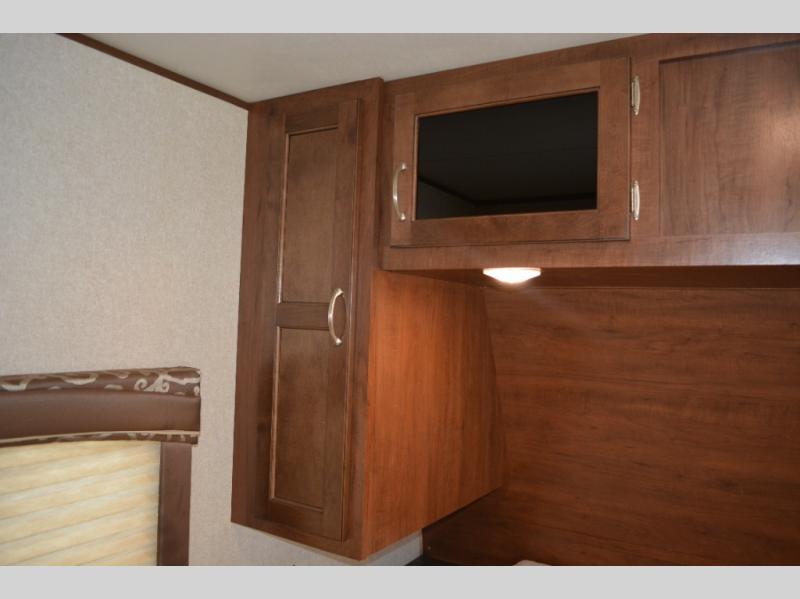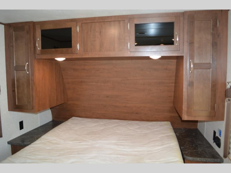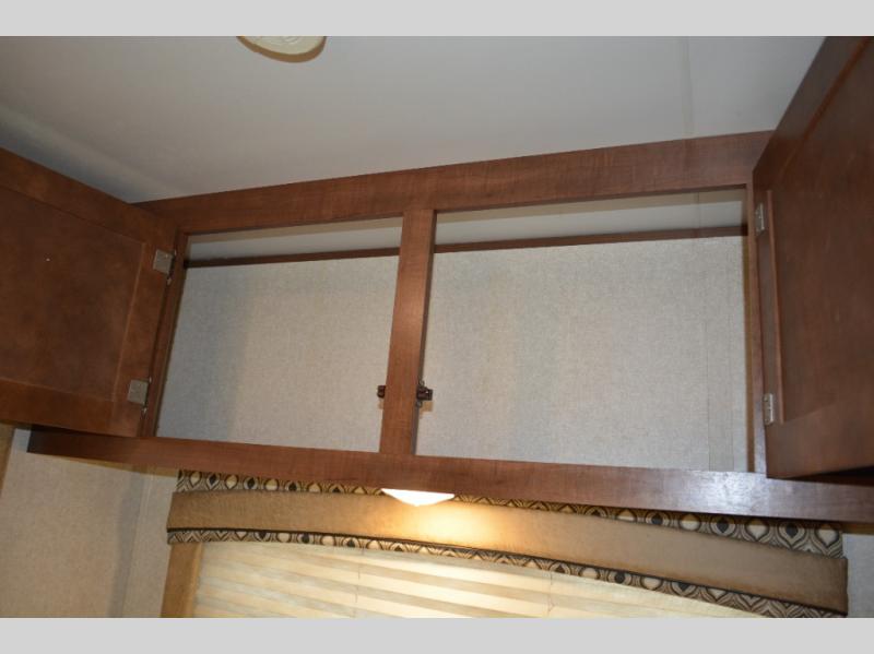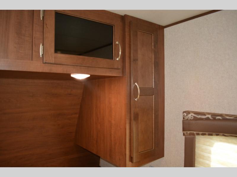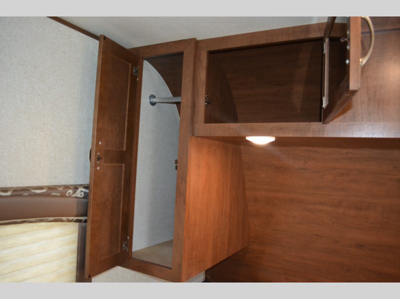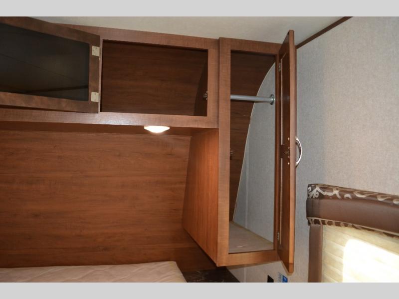 In this model you will find a front bedroom which features a 74" queen bed, two wardrobes, and an overhead cabinet. At night close the curtain for a bit more privacy from the rest of the trailer.