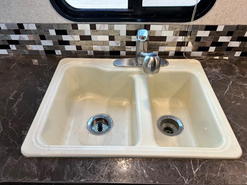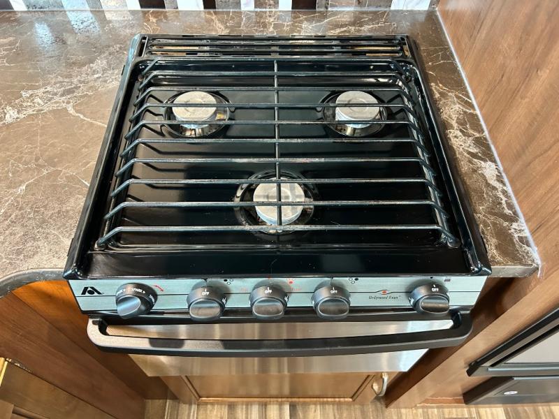 The kitchen is in the rear of the trailer. There is a l-shaped counter with a double kitchen sink. Along the rear wall you will find a three burner range, microwave, refrigerator, and a pantry. Overhead cabinets in the kitchen can be used to store dishes and such.