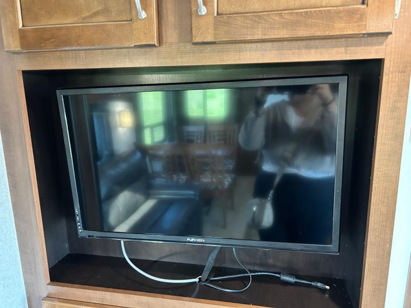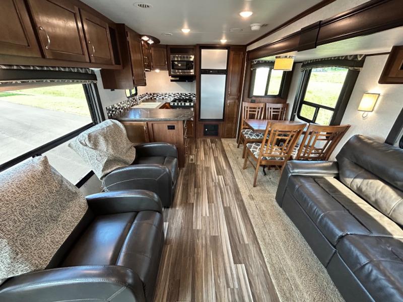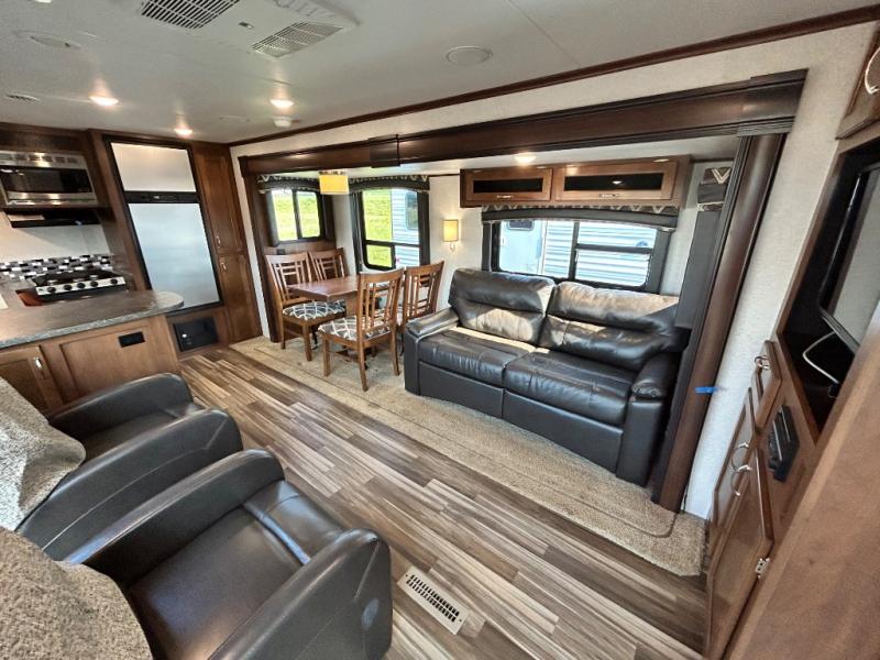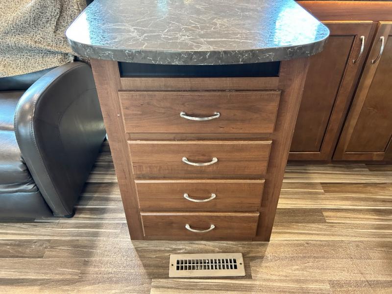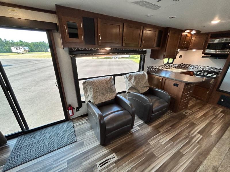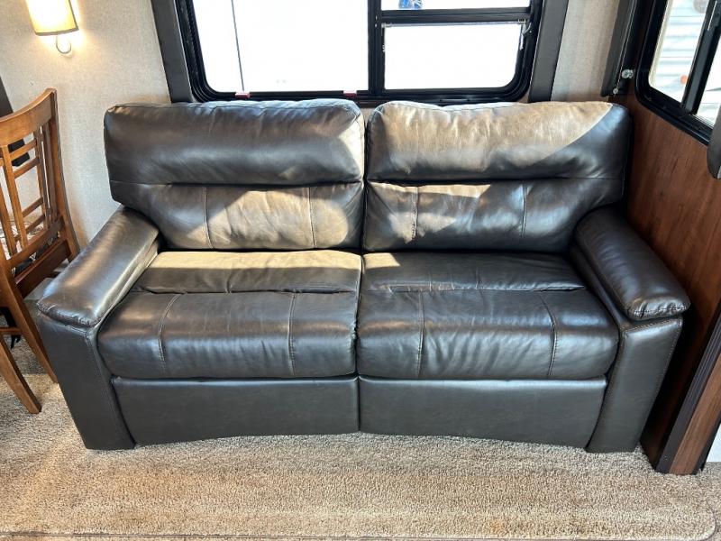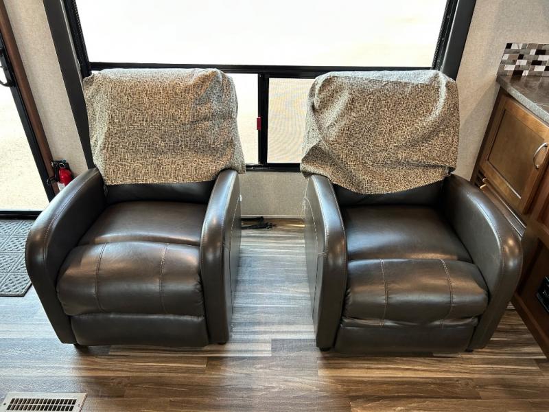 Stepping inside the travel trailer, to your left there are two lounge chairs. The opposite side has a slide with a dinette or an optional free-standing table and chairs, and a sofa or an optional hide-a-bed. Next to the slide there is an entertainment center.