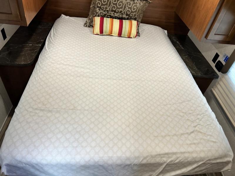 You can enter the front bedroom from either the hallway or from the bathroom. The front bedroom features a queen bed, two wardrobes for your hanging clothes, and overhead storage.