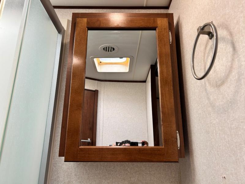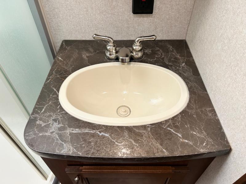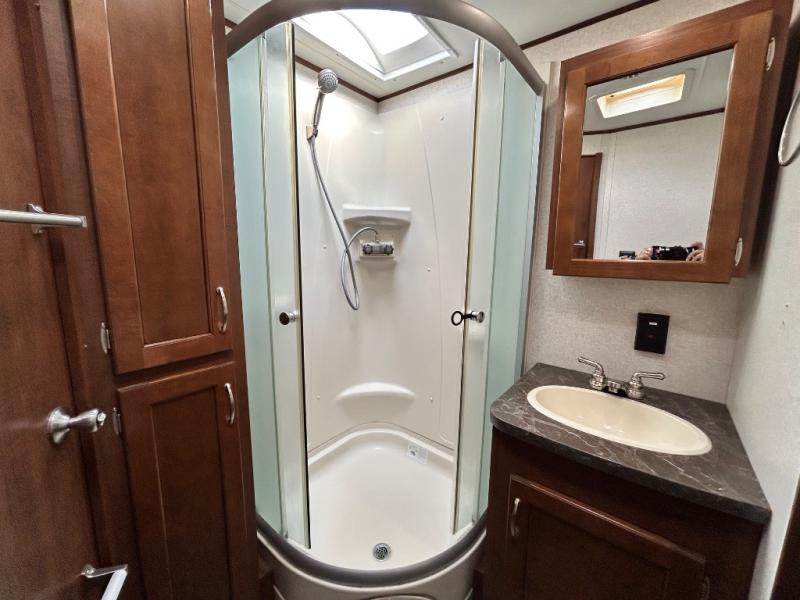 As you proceed toward the front the bathroom is on your left. Inside the bathroom you will find a linen cabinet, radius shower, sink, and toilet.