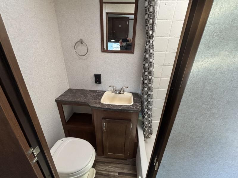 Stepping inside the travel trailer, straight in front of you is the side aisle bathroom. Inside the bathroom there is a toilet, sink, tub/shower.