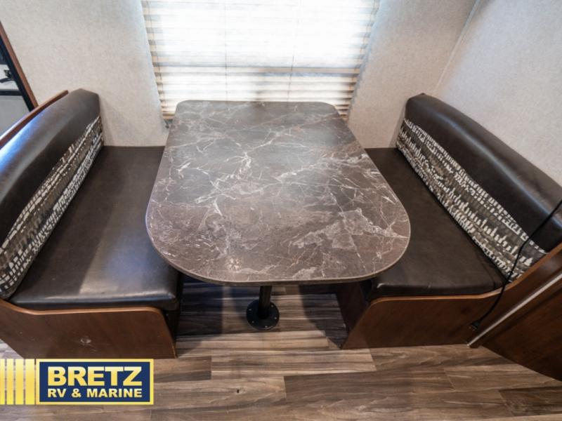 As you enter the travel trailer, to the left there is a dinette. Across from the dinette you will see a refrigerator, three burner range, microwave, and double kitchen sink. There is also a nice sofa in the main living area.