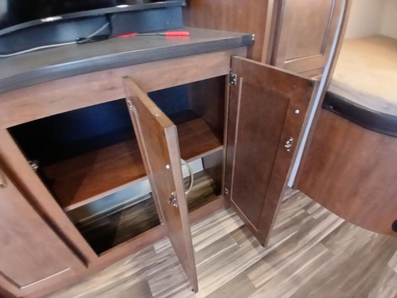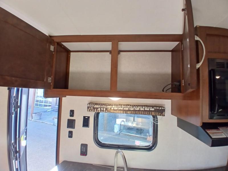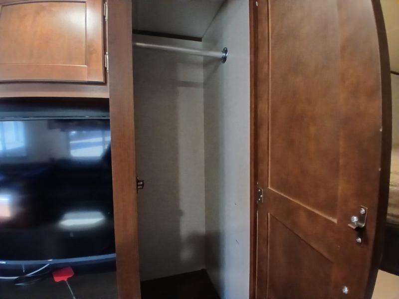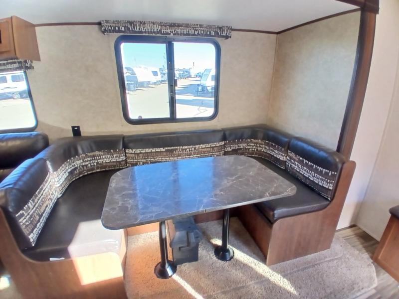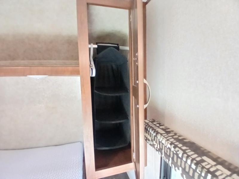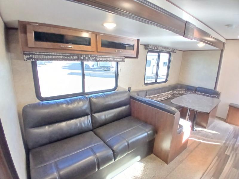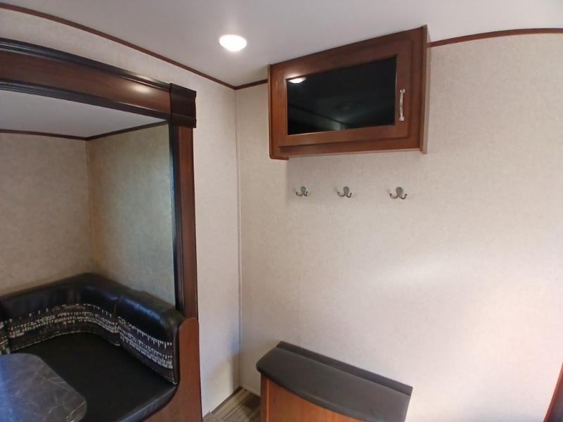 Along the door side of this model is where you will find the kitchen appliances such as an angled double sink, overhead cabinets, microwave, three burner range, and a refrigerator. Continuing along this wall there is an entertainment center where you can watch your favorite movies or shows, and a wardrobe for your hanging clothes. Along the opposite side of the trailer there is a slide out with a u-dinette and a sofa. Both of these offer great seating options during the day, and at night you can convert the sofa and dinette into additional sleeping space. Adjacent to the slide out is a bench/storage and an overhead cabinet.