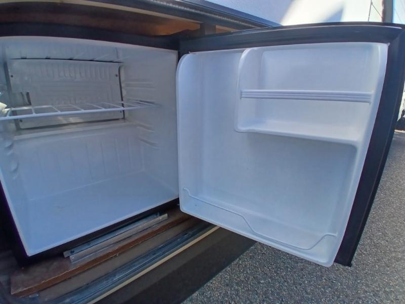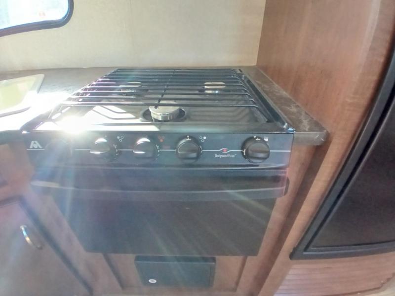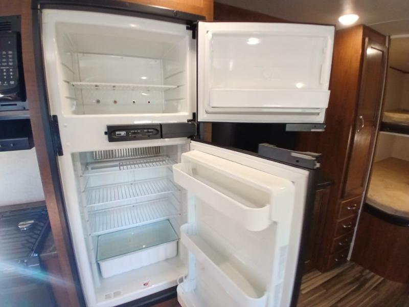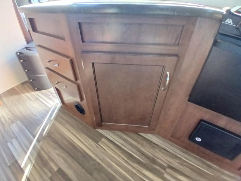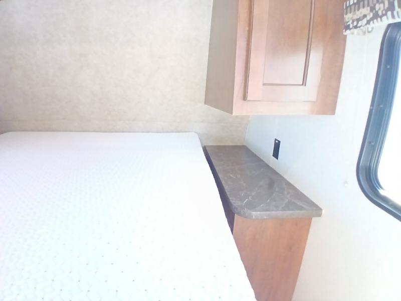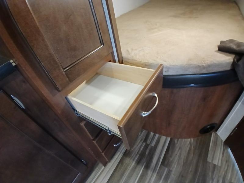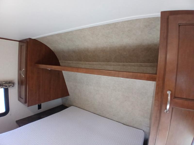 Along the door side of this model is where you will find the kitchen appliances such as an angled double sink, overhead cabinets, microwave, three burner range, and a refrigerator. Continuing along this wall there is an entertainment center where you can watch your favorite movies or shows, and a wardrobe for your hanging clothes. Along the opposite side of the trailer there is a slide out with a u-dinette and a sofa. Both of these offer great seating options during the day, and at night you can convert the sofa and dinette into additional sleeping space. Adjacent to the slide out is a bench/storage and an overhead cabinet.