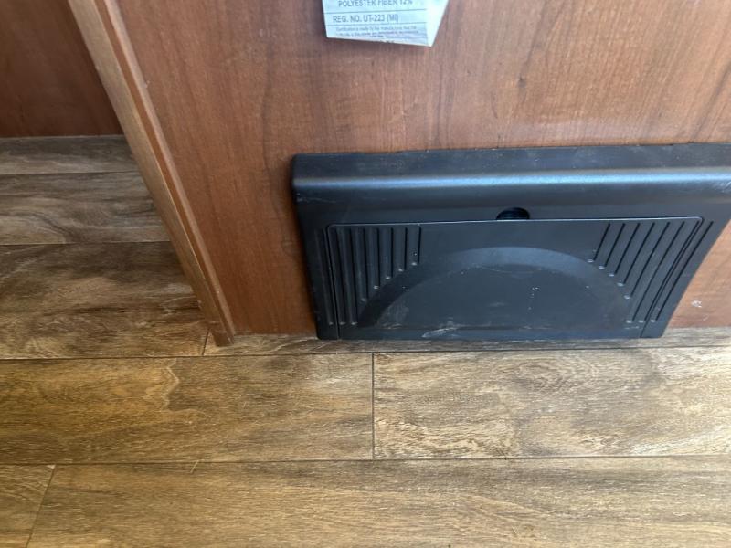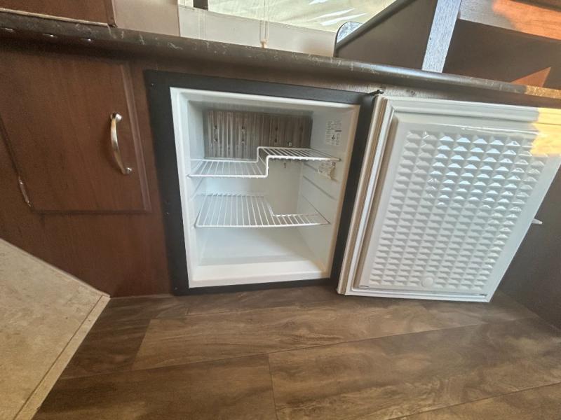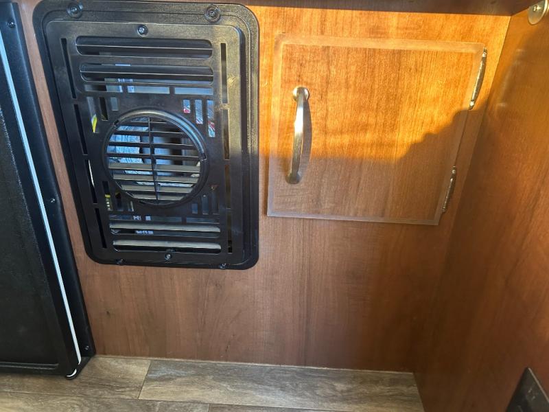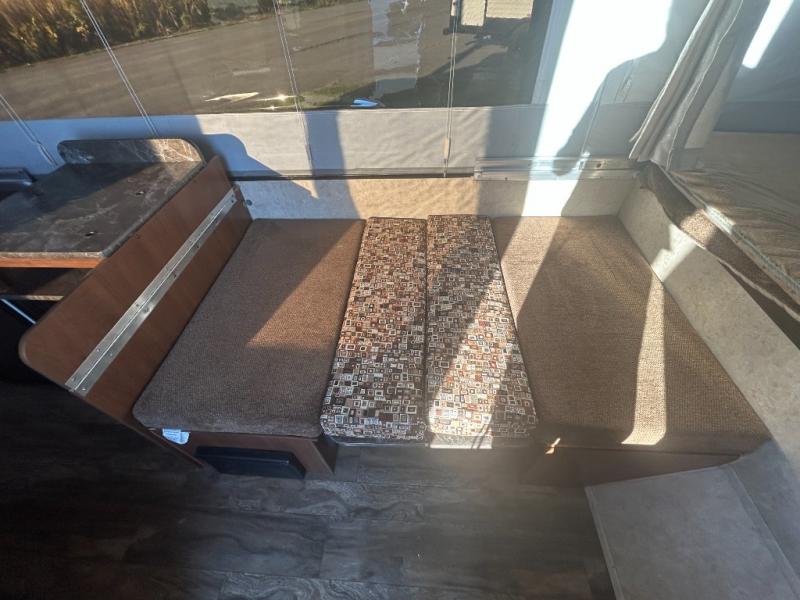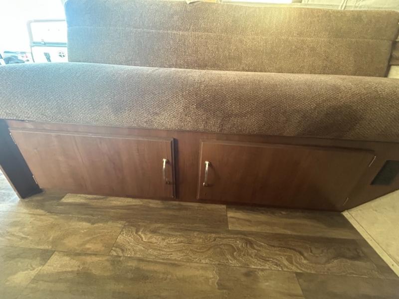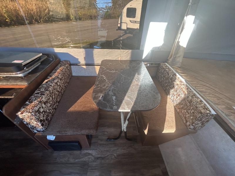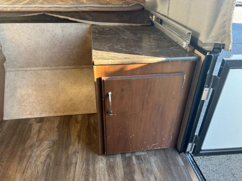 As you enter the camper, to the left there is a large storage cabinet. To the right of the entrance you will find a second storage cabinet. The opposite side of the camper offers a dinette, two burner range, and sink.