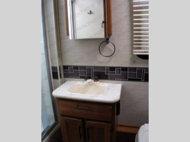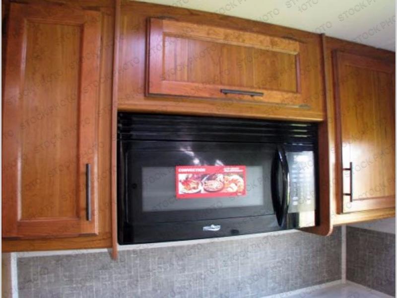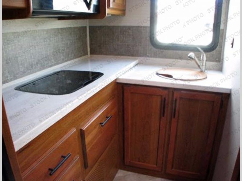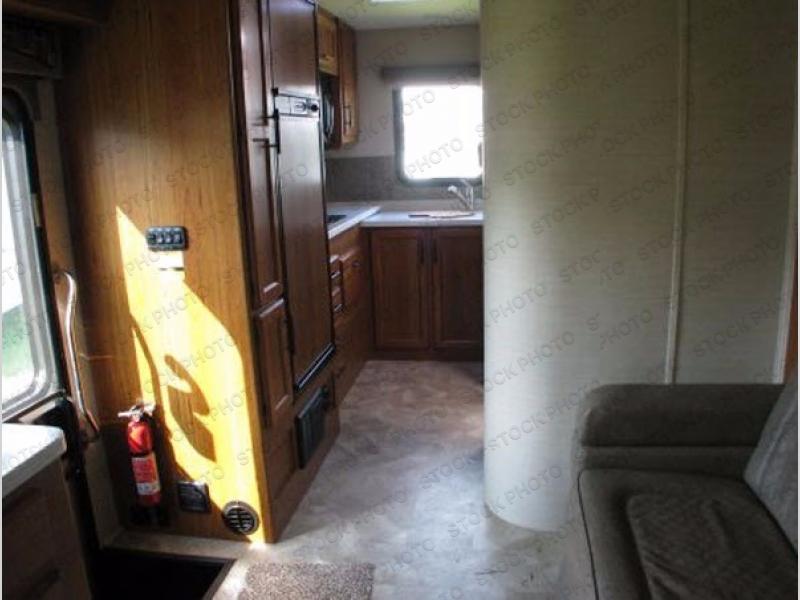 The kitchen area is located along the door side toward the rear of this model. To the left of the entry door there is a pantry, 8 cu. ft. refrigerator, a two burner range, microwave, and a single sink, as well as extra counter space.