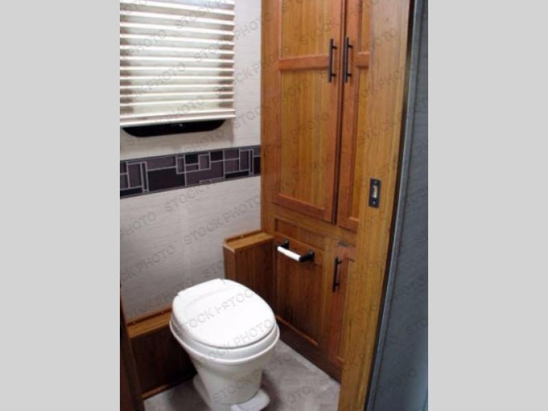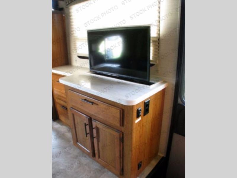 Straight in from the entry door there is a slide out with a sofa and an overhead cabinet. To the right of the entry door there is a 32" TV lift, a dresser, and an overhead cabinet. Your kids can share the cab-over bunk, or maybe you have a grandchild or two that you want to take camping.