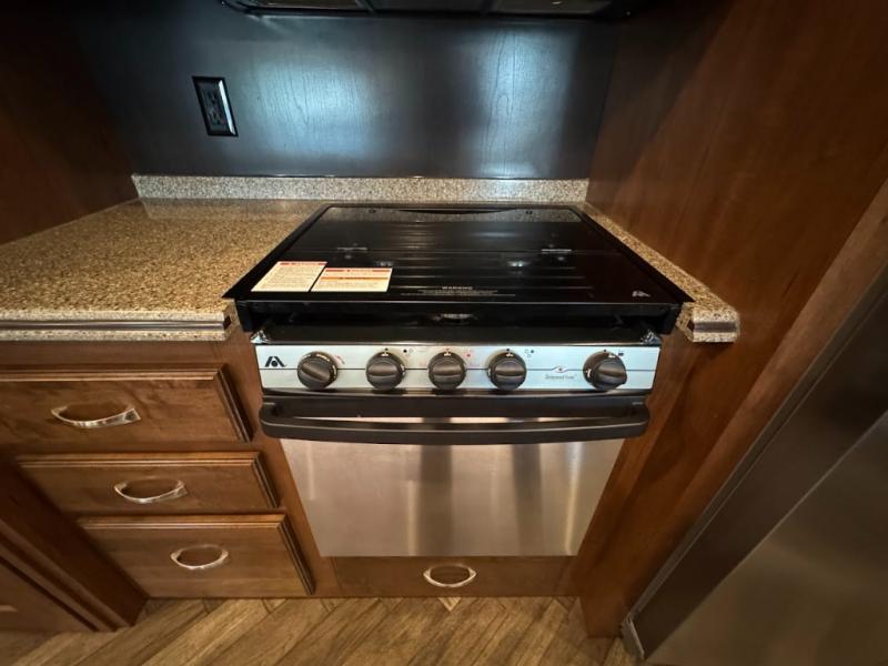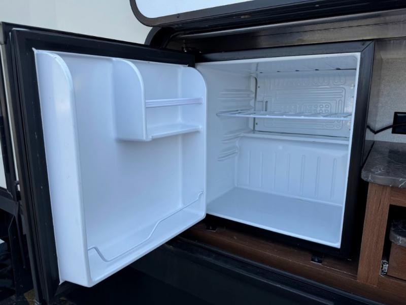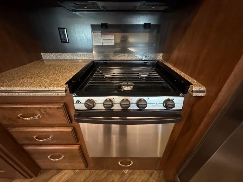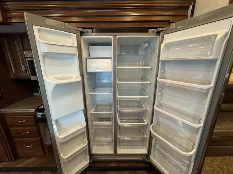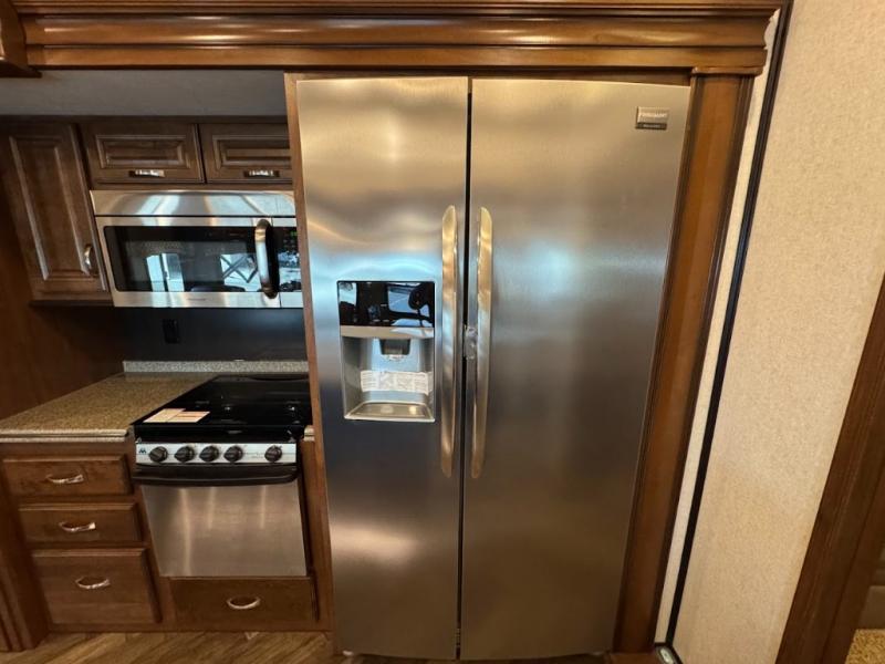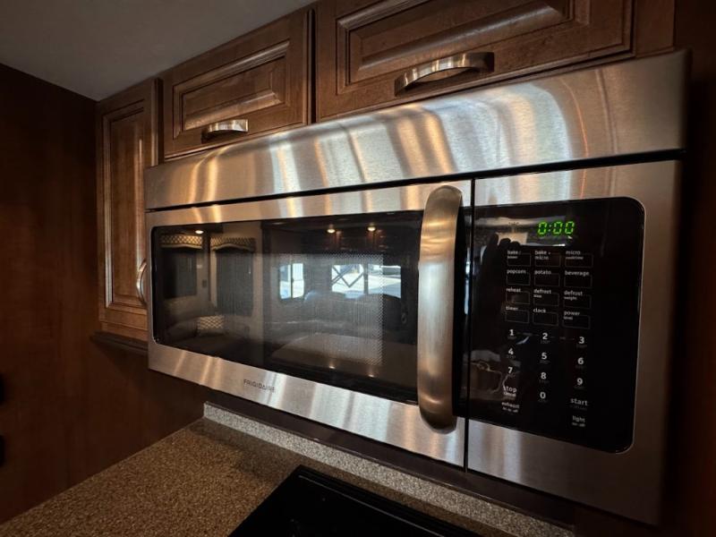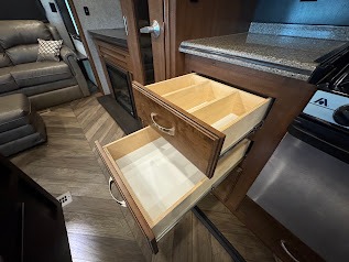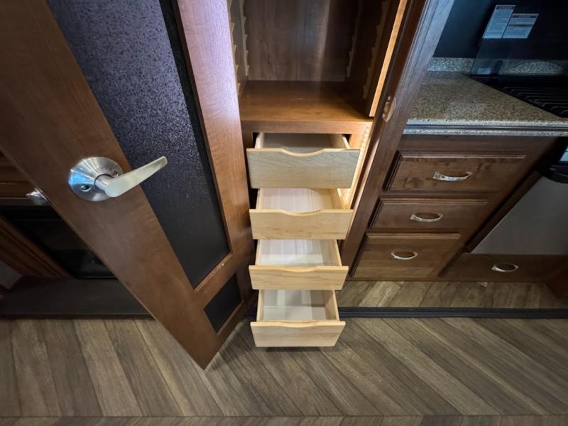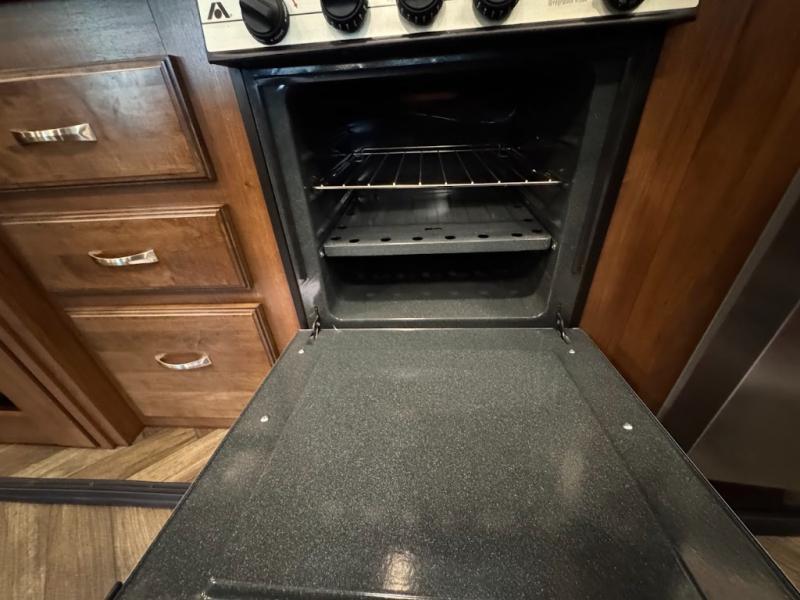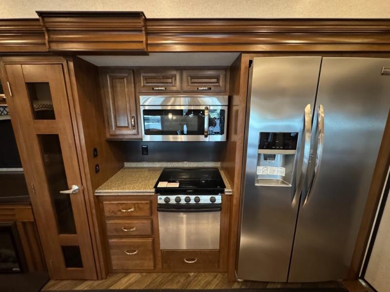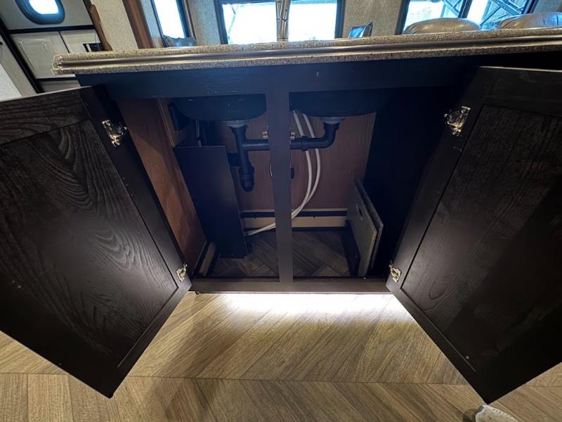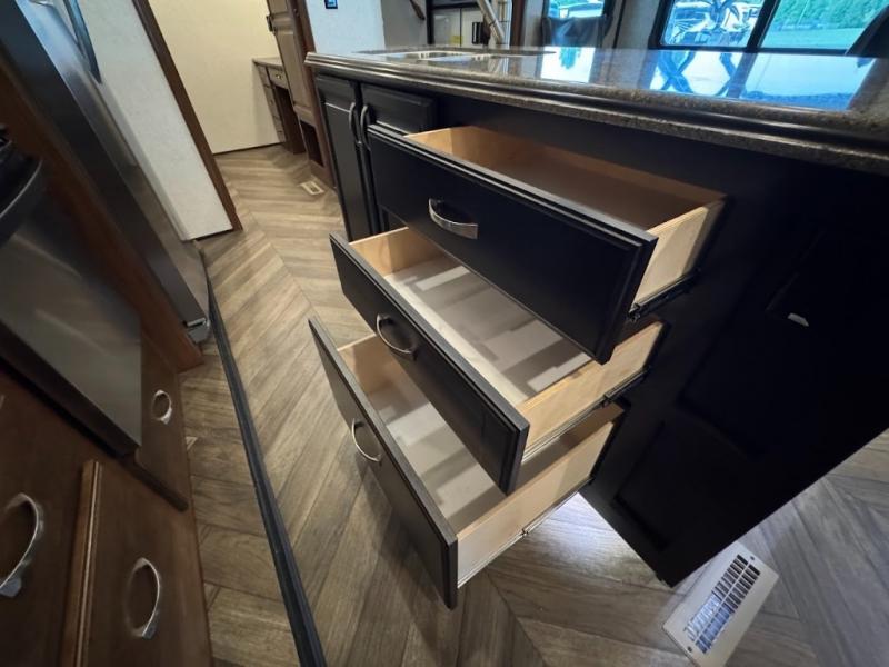 Back to the main entry head left into the front combined kitchen and living room space. Here you will find a slide out dining table with four chairs, and theater sofa for two along the curb side wall just inside the door. You can choose two recliners in place of the theater sofa if you like. Opposite the door side is a kitchen slide that contains a lift TV with fireplace below on one end, and kitchen amenities on the other end. You can easily create meals and snacks with the appliances included. There is a 12 cu. ft. refrigerator or choose an optional residential refrigerator, a three burner range with overhead microwave oven, and a pantry. A convenient kitchen island offers added counter food prep space and a double sink making cleaning up a cinch.
