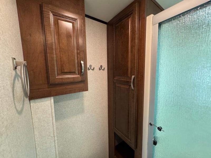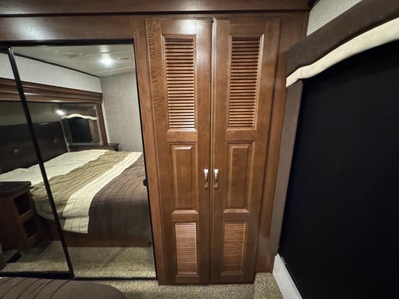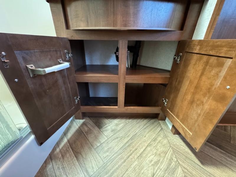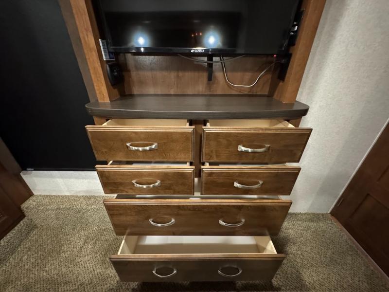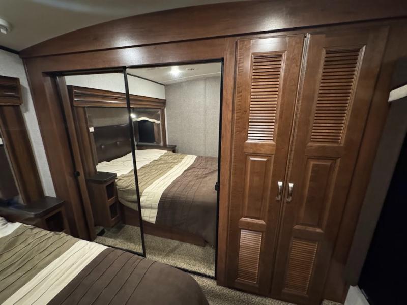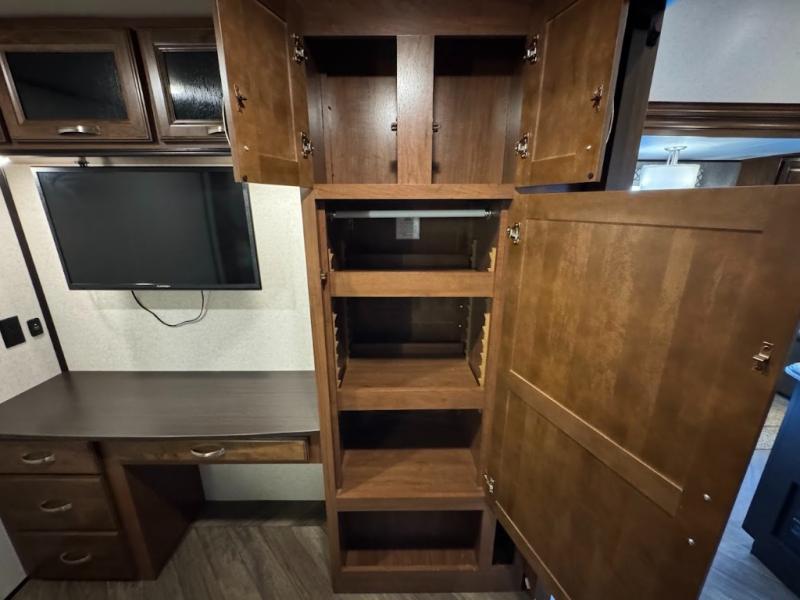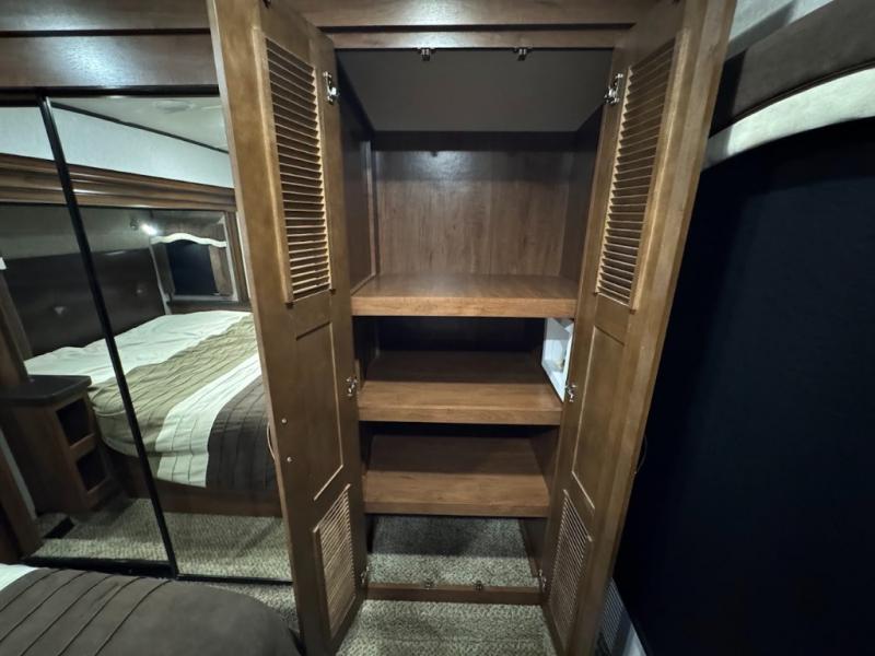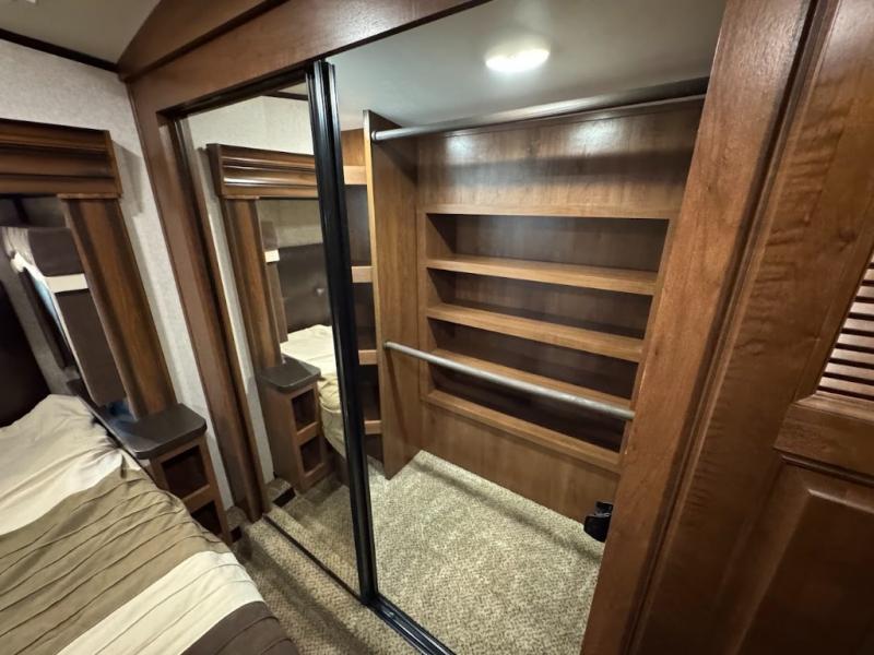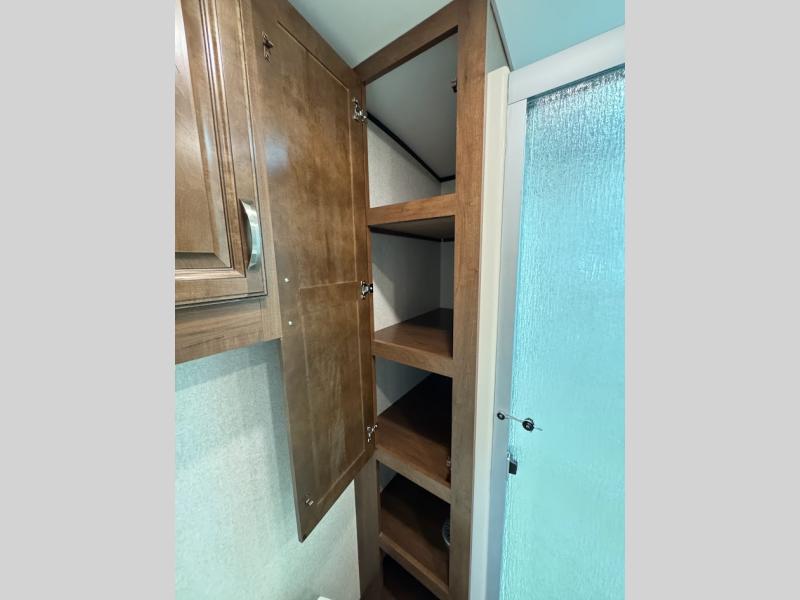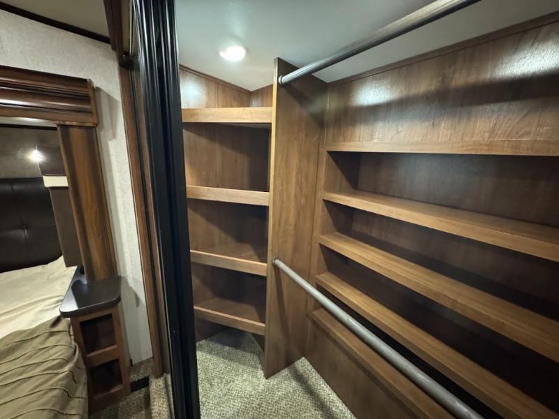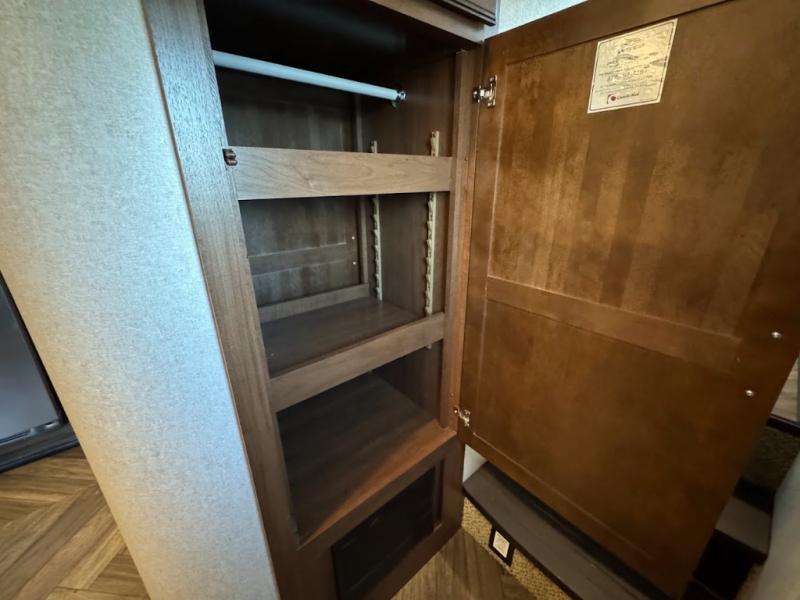 At the end of the hall enter the bedroom where you can rest comfortably on a queen slide out bed with shelf on each side. You can choose a king size bed if you like. There is a chest of drawers opposite with TV above, and a walk-in closet for all of your hanging clothes along the front all. You will also love the additional storage closet where you can add a washer and dryer if you choose.