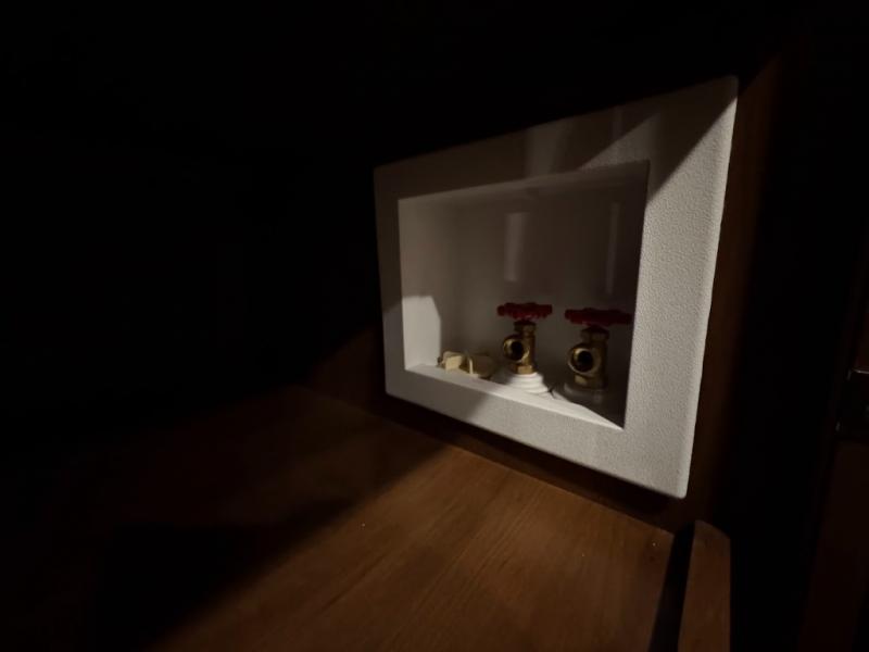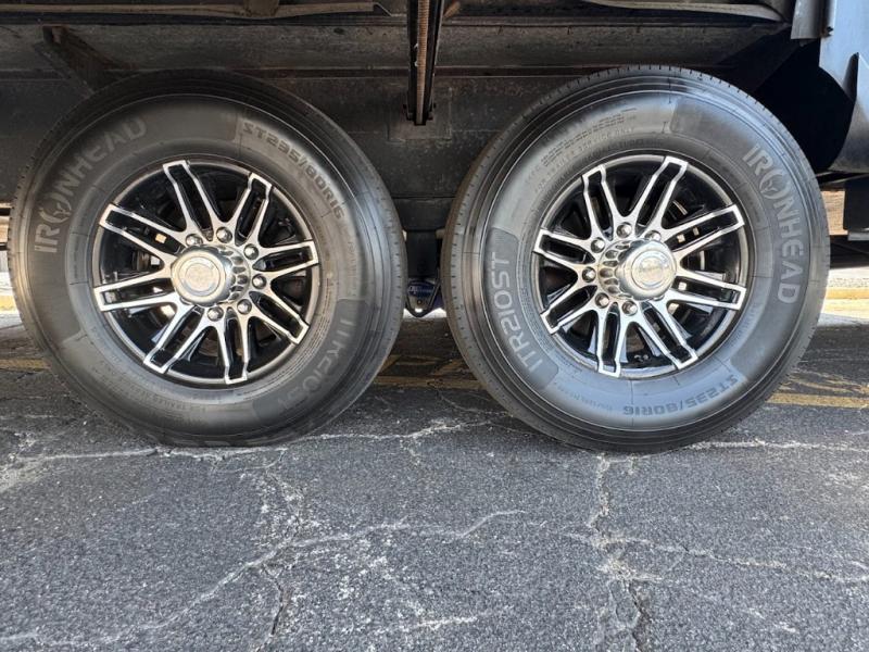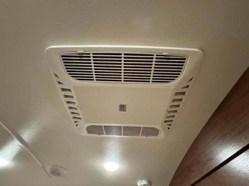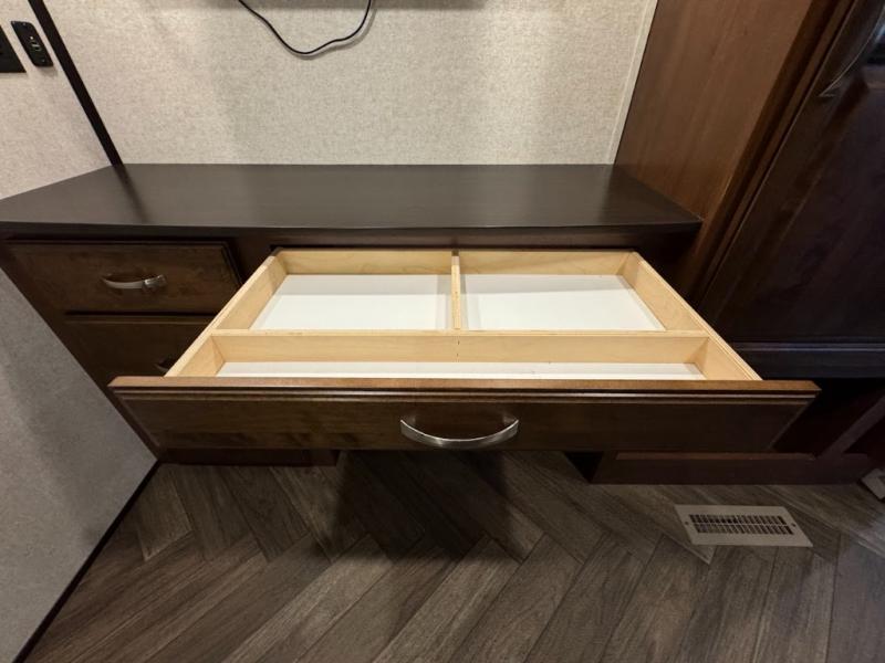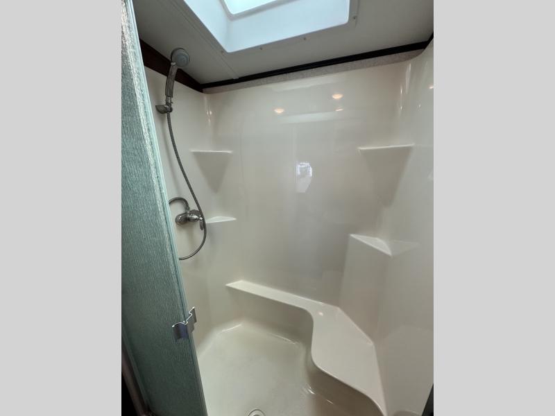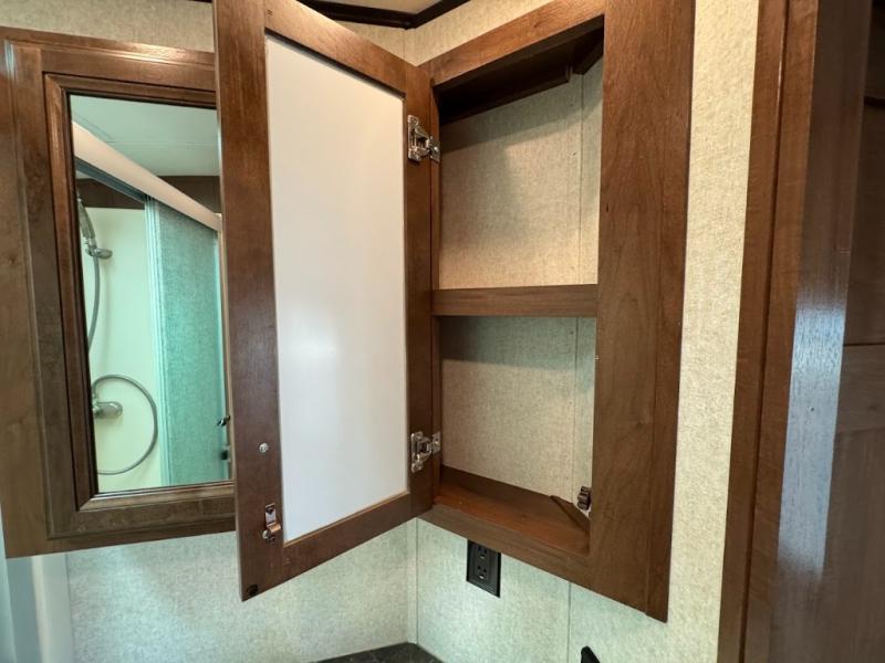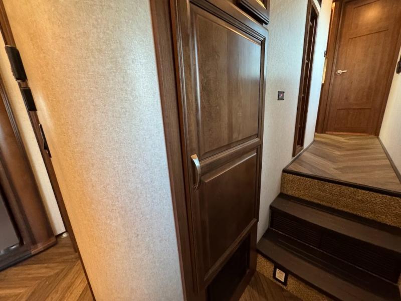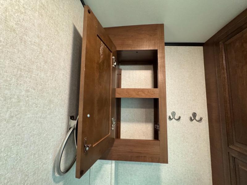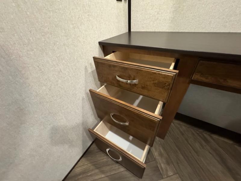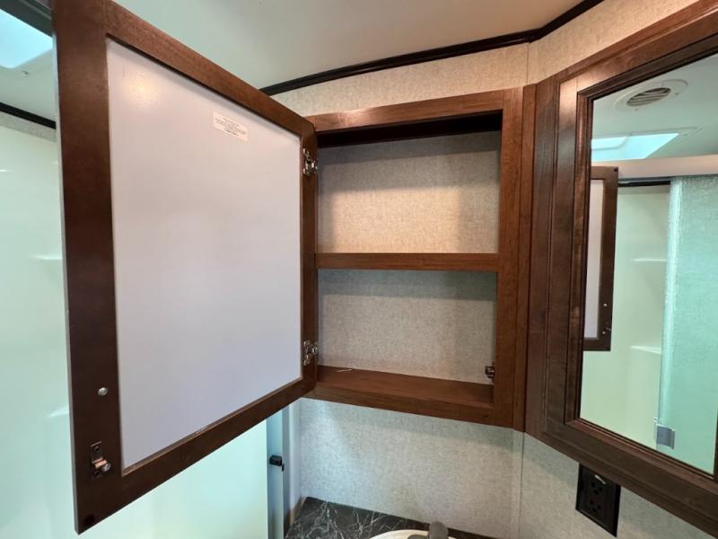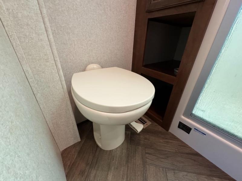 At the end of the hall enter the bedroom where you can rest comfortably on a queen slide out bed with shelf on each side. You can choose a king size bed if you like. There is a chest of drawers opposite with TV above, and a walk-in closet for all of your hanging clothes along the front all. You will also love the additional storage closet where you can add a washer and dryer if you choose.