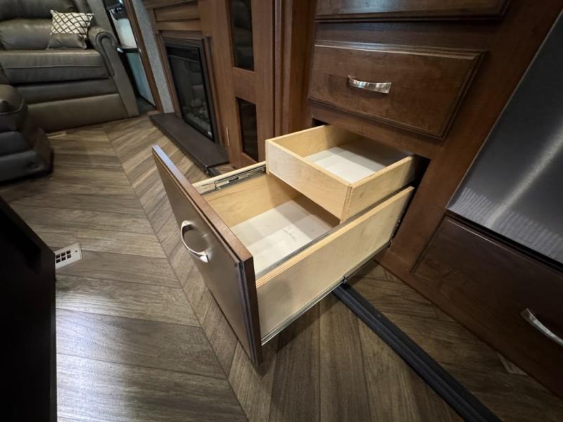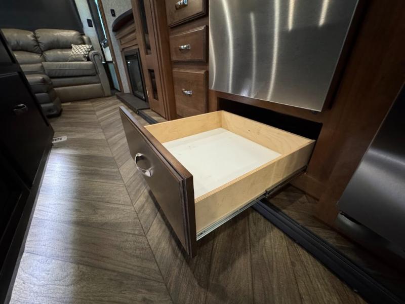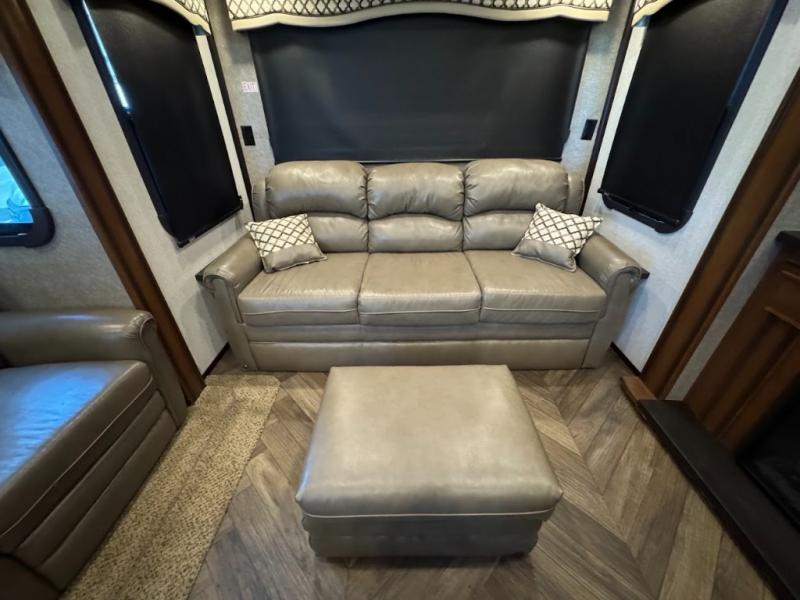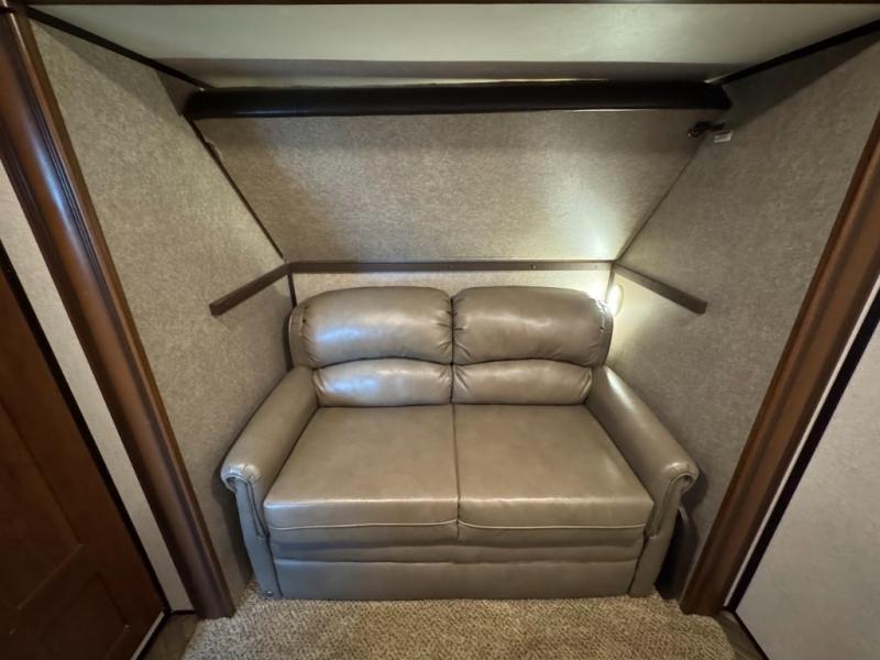 Along the rear wall of this North Point model there is a tri-fold hide-a-bed sofa with ottoman and overhead storage that stretches the entire width of the fifth wheel. This will make it easy to keep things neatly tucked away and organized.