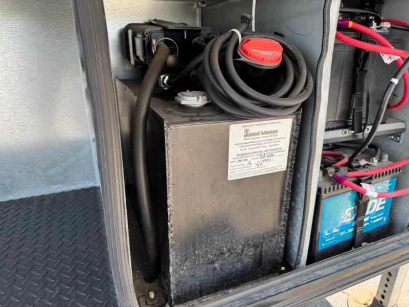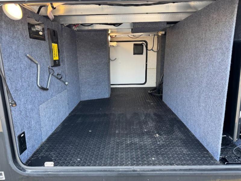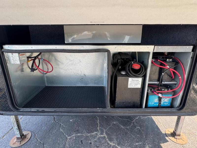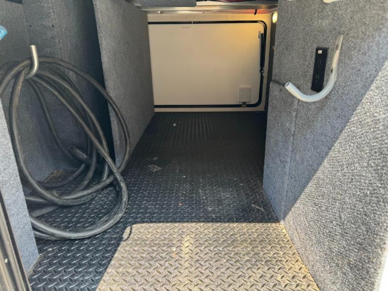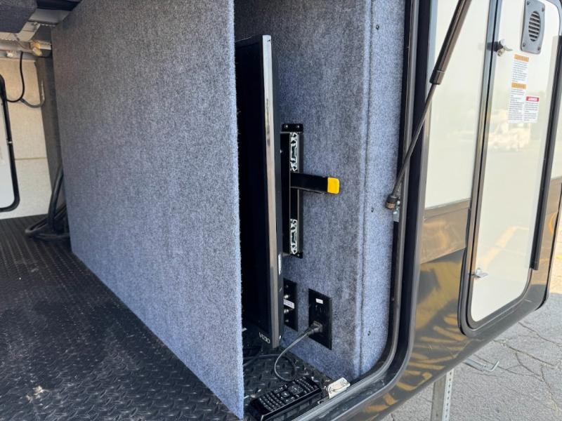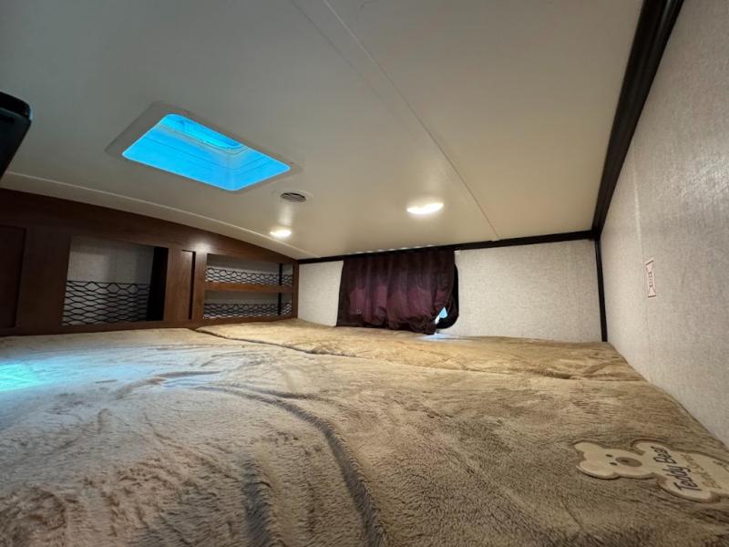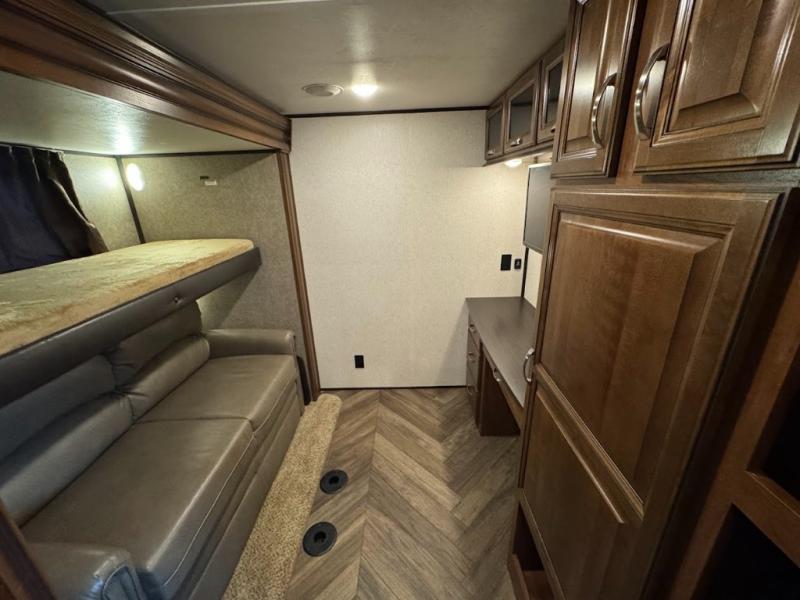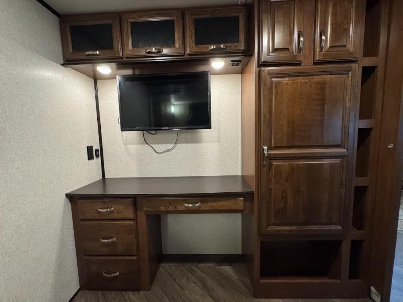 Just off the kitchen area find a bonus room with loft above. The room can serve as a den, or an extra bedroom, or for whatever you need. There is a bi-fold hide-a-bed with flip up bunk slide along the road side, a removable table, and a closet with desk space including a TV above along the interior wall.