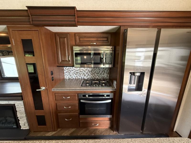 Back to the main entry head left into the front combined kitchen and living room space. Here you will find a slide out dining table with four chairs, and theater sofa for two along the curb side wall just inside the door. You can choose two recliners in place of the theater sofa if you like. Opposite the door side is a kitchen slide that contains a lift TV with fireplace below on one end, and kitchen amenities on the other end. You can easily create meals and snacks with the appliances included. There is a 12 cu. ft. refrigerator or choose an optional residential refrigerator, a three burner range with overhead microwave oven, and a pantry. A convenient kitchen island offers added counter food prep space and a double sink making cleaning up a cinch.