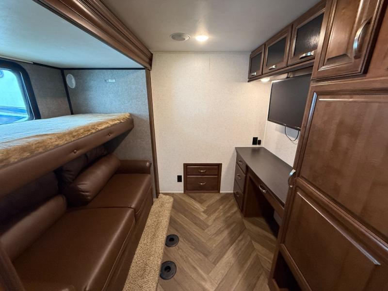 Just off the kitchen area find a bonus room with loft above. The room can serve as a den, or an extra bedroom, or for whatever you need. There is a bi-fold hide-a-bed with flip up bunk slide along the road side, a removable table, and a closet with desk space including a TV above along the interior wall.