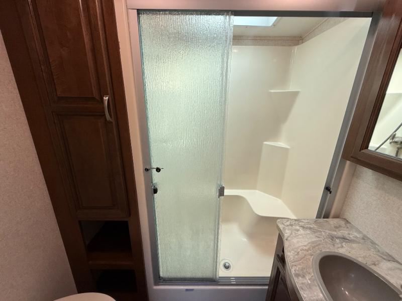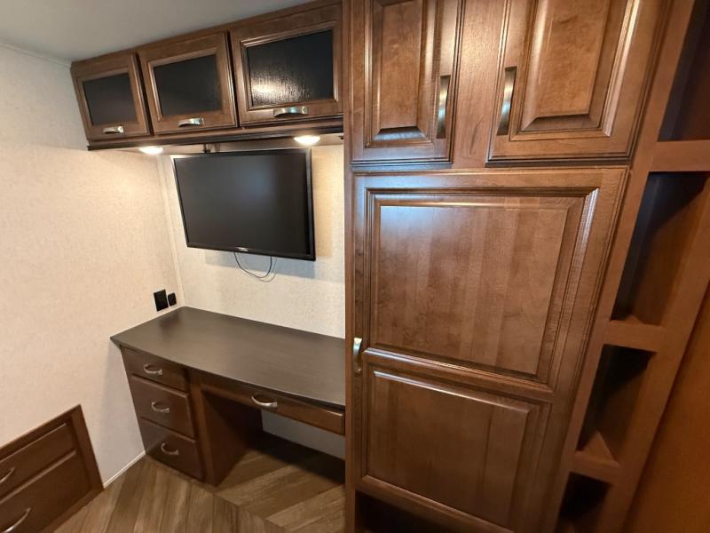 At the end of the hall enter the bedroom where you can rest comfortably on a queen slide out bed with shelf on each side. You can choose a king size bed if you like. There is a chest of drawers opposite with TV above, and a walk-in closet for all of your hanging clothes along the front all. You will also love the additional storage closet where you can add a washer and dryer if you choose.
