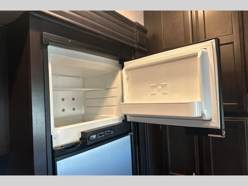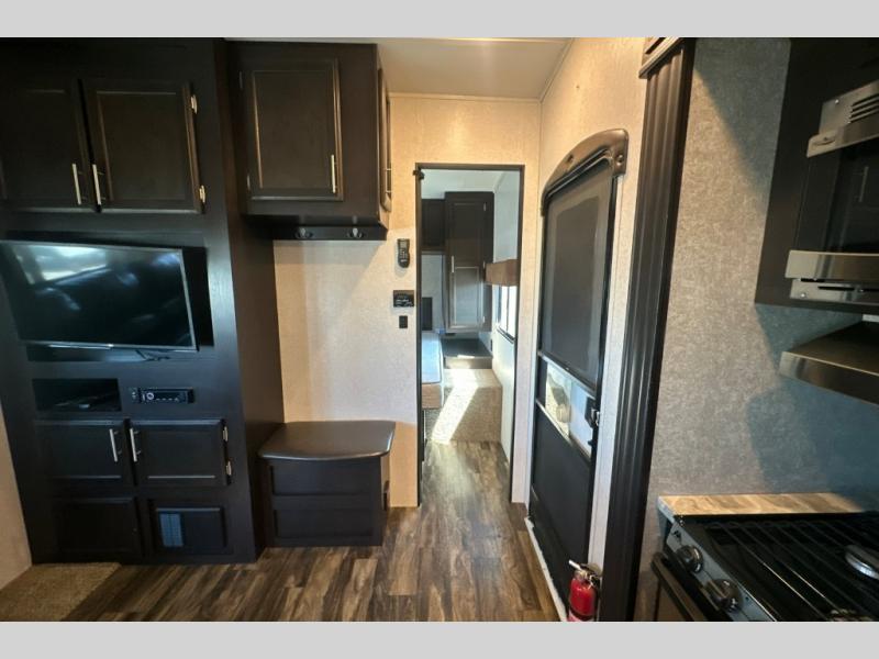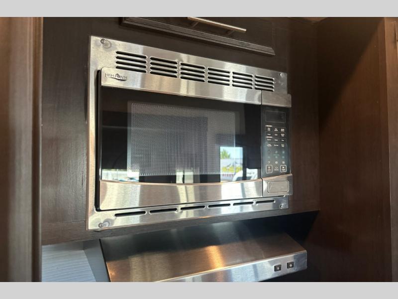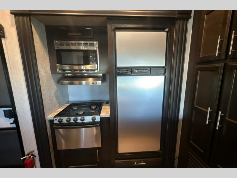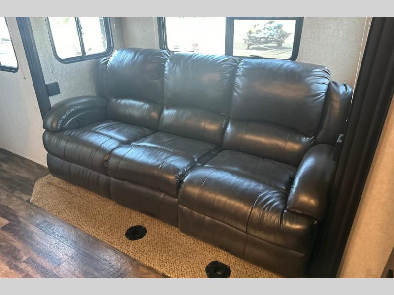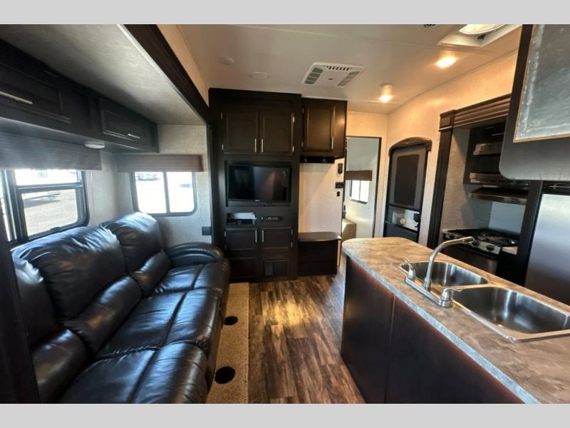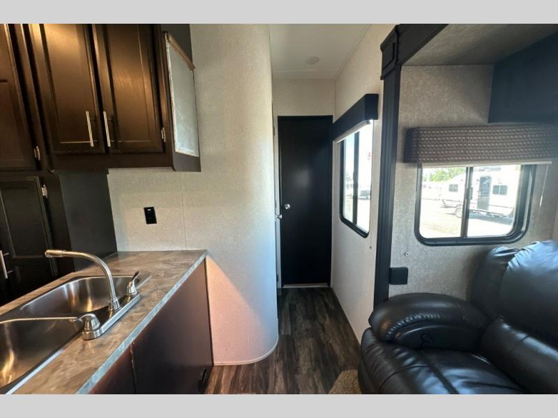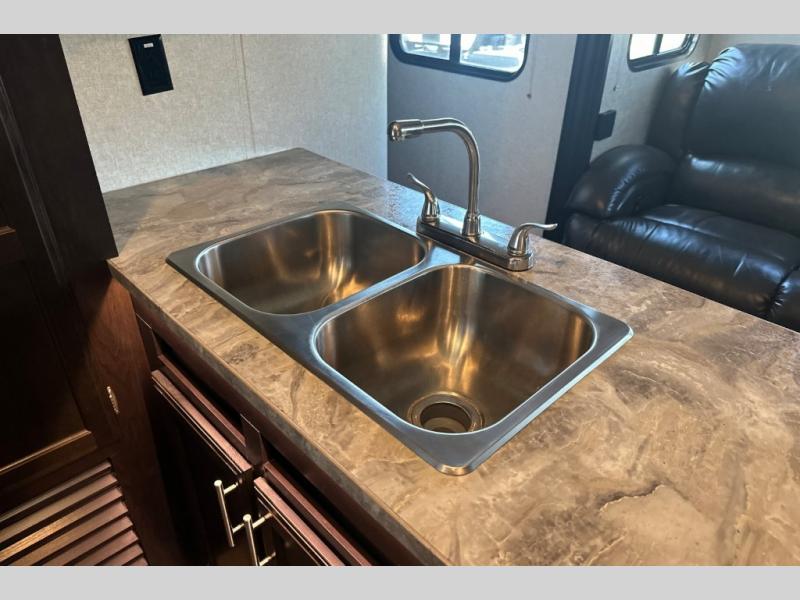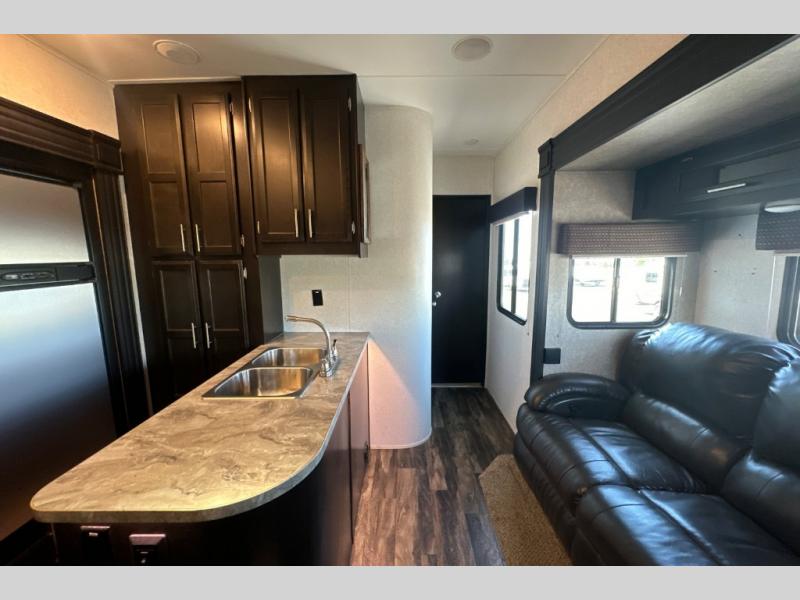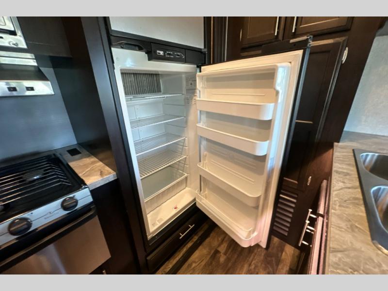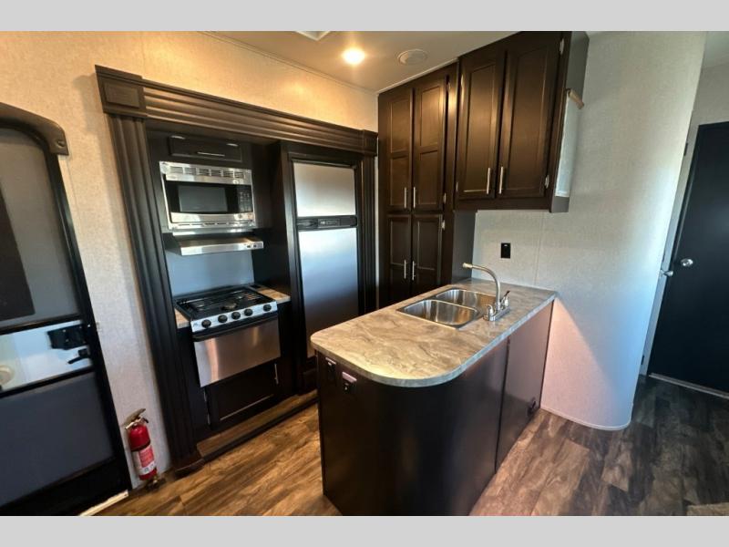 You can also enter the main living and kitchen area from the curb side main entry. Straight ahead you will see theater seating for three in a slide out, while the opposite side has a slide out refrigerator, microwave, and two burner range. Next to the refrigerator you will find a nice size pantry, and plenty of counter space including a double kitchen sink on a counter peninsula.