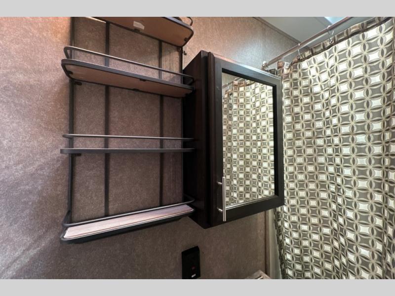 The side aisle bath is between the cargo inside entrance and the main living area. Inside, there is a tub/shower, toilet, and sink with medicine cabinet.