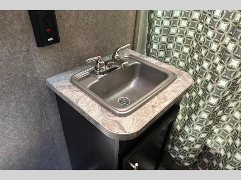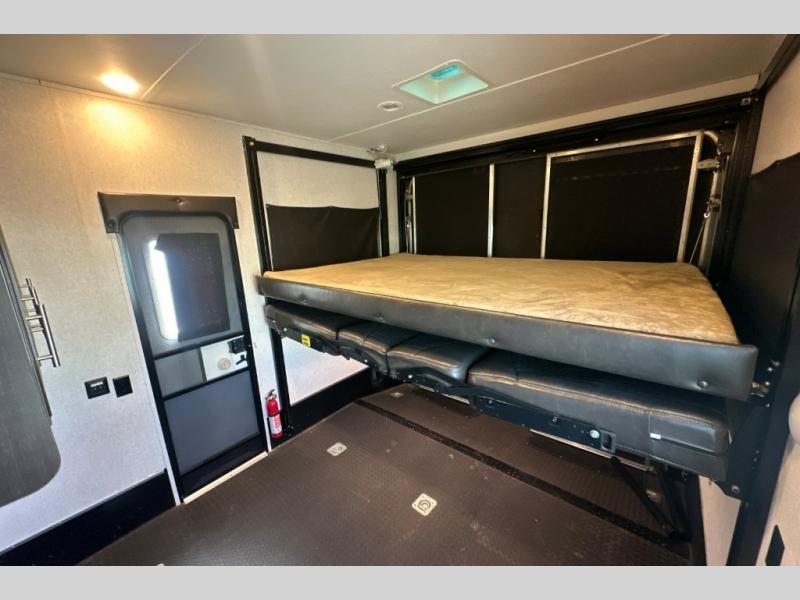 In the cargo area you will find 10' of space to store your toys and gear while you travel. Once you are at your destination, this area can be transformed into living/sleeping space. There is a queen bed above two convertible sofas, and between the sofas you will find an indoor/outdoor table where you can enjoy your meals inside or outside. The handy side man door allows easy access to your toys, overhead storage, and inside entrance into the main living area in the trailer.