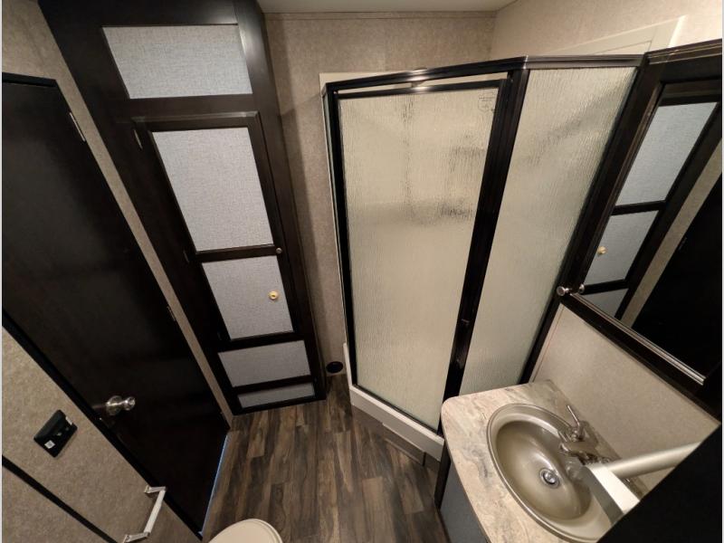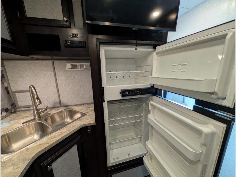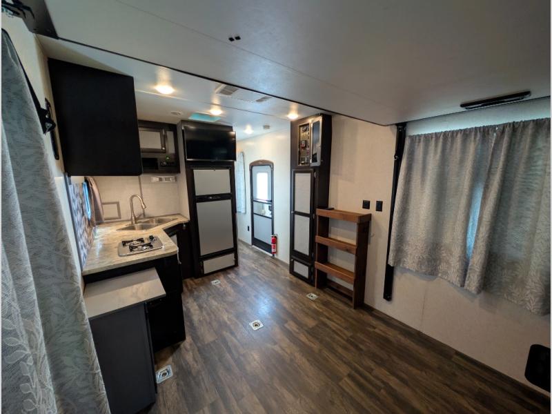 The kitchen area has a two burner range, microwave, double kitchen sink, overhead cabinets, and a refrigerator along the road side and interior wall. Across from the range you will find a nice pantry which provides additional storage for your food items.