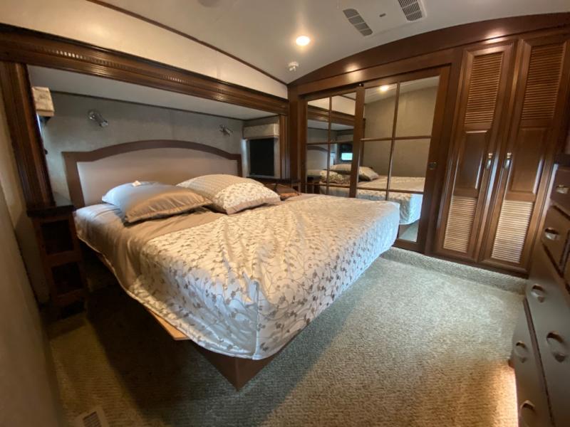 The bedroom has a king bed slide out with shelves or you can choose an optional queen with chests on either side of the bed. Enjoy the storage underneath the bed, plus all of the room in the walk-in closet. In the corner of the room there is an area that has been prepped for a washer/dryer, and across from the bed there is a chest with a TV.