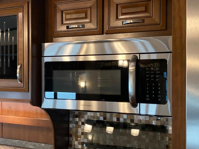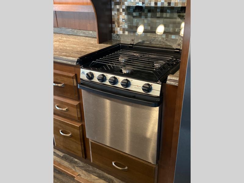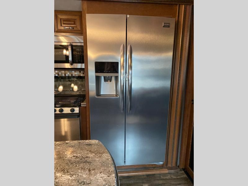 As you enter the fifth wheel, to the left there is a slide out with a free-standing table and theater seating or you can choose optional recliners. Along the rear wall you will enjoy a tri-fold hide-a-bed or choose an optional reclining sofa. The slide out along the road side has an entertainment center with fireplace below, cabinets, microwave, three burner range, and a residential refrigerator. There is a kitchen island with lots of counter space and a double kitchen sink. On the interior wall of the kitchen there is a large pantry with sliding doors and a wardrobe.