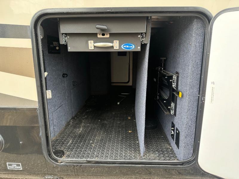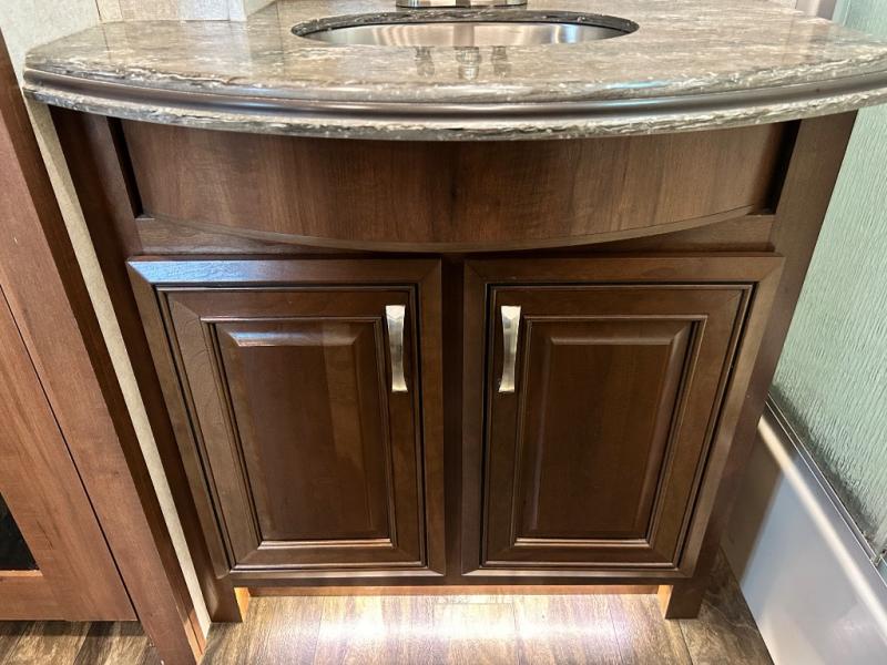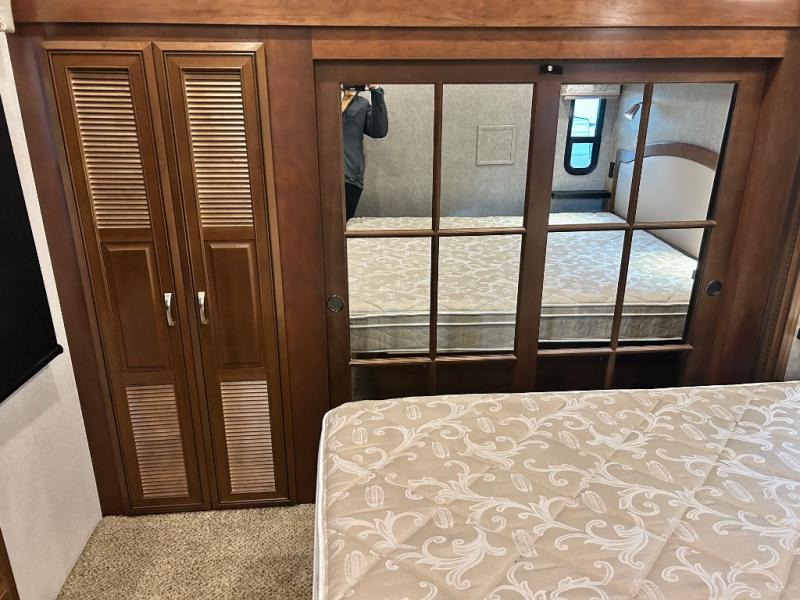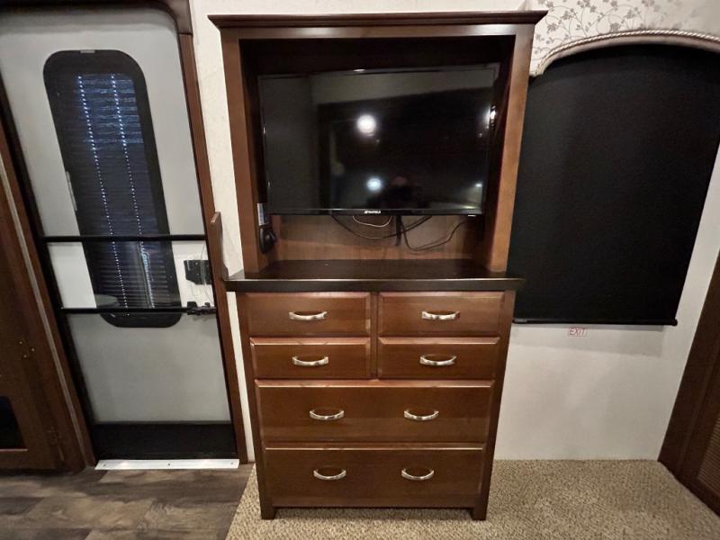 In the rear bedroom there is a king bed slide with shelves and overhead cabinets or you can choose an optional queen with chest storage on either side, a walk-in closet, and a chest with a TV above the chest. In the corner of the room you will find that it has been prepped for a washer and dryer. The second entrance/exit to the fifth wheel is in the bedroom.
