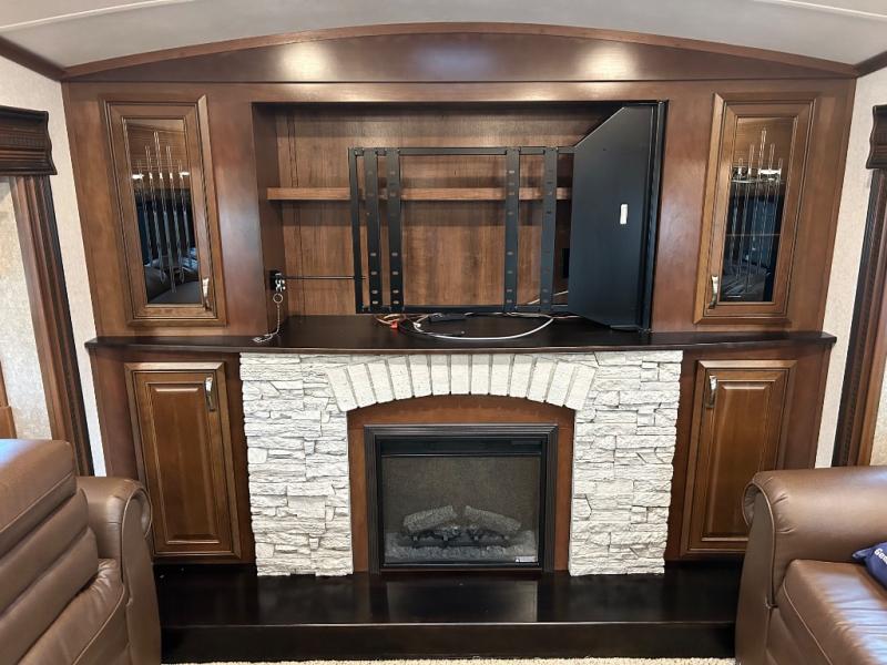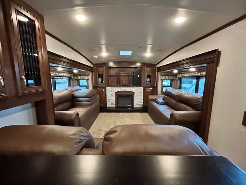 Looking for lots of space? Then you will find it inside this FIVE slide Jayco Pinnacle 38FLSA fifth wheel with dual entries, plus a full wall entertainment center with a TV and Ledgestone surround fireplace.