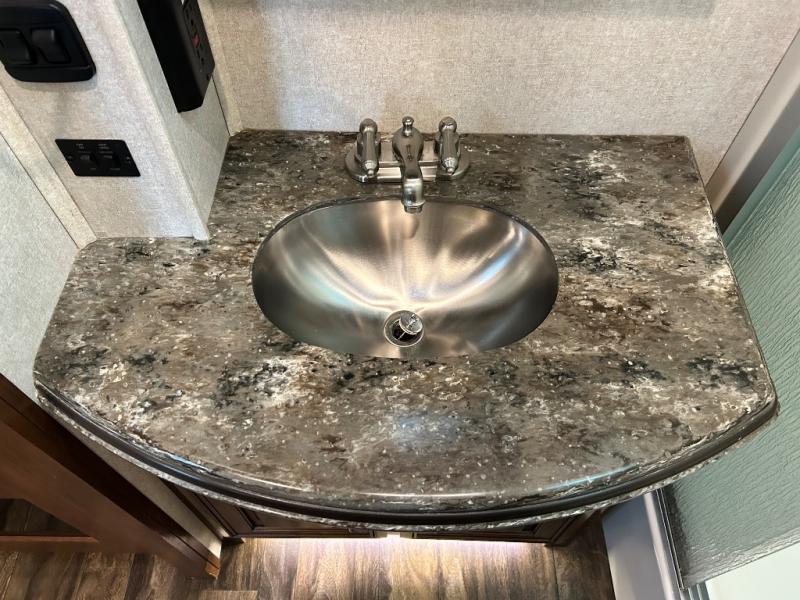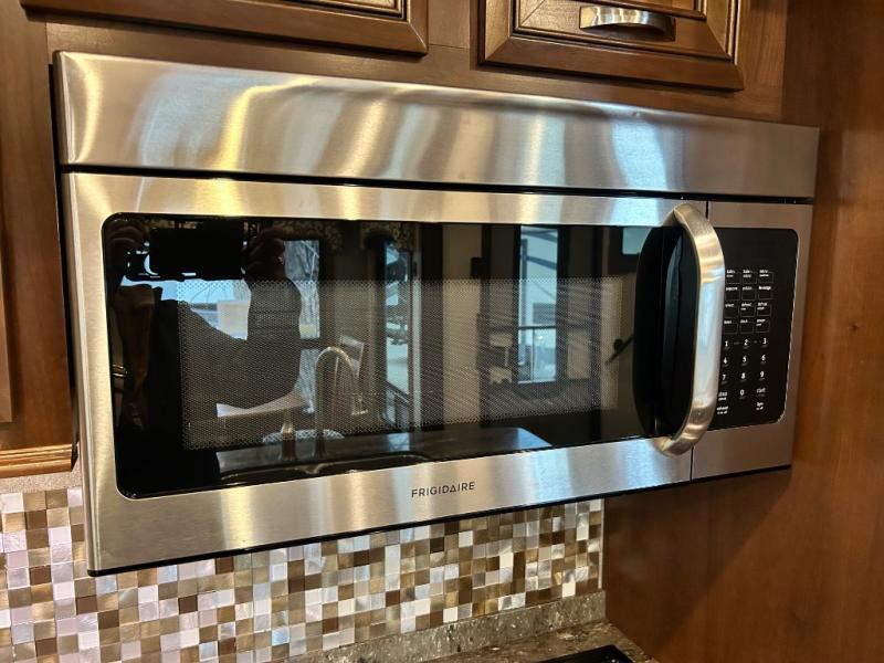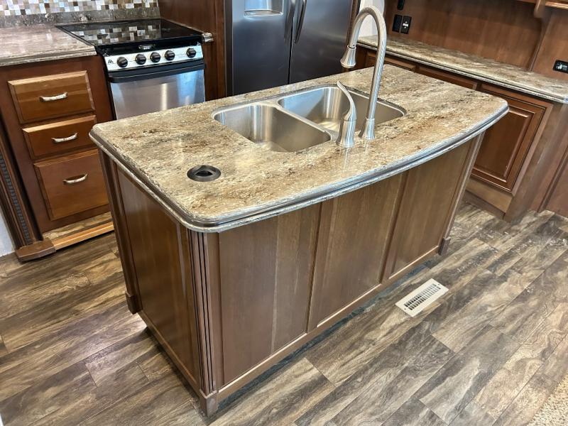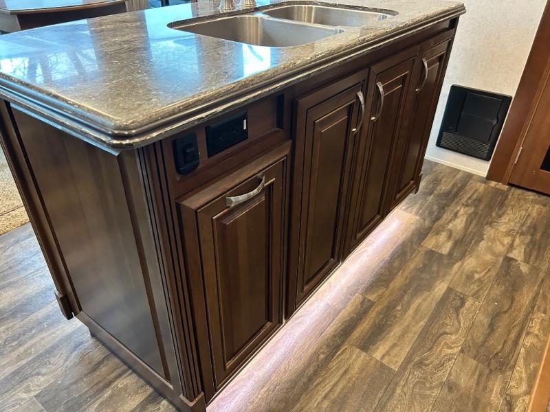 The opposite side of the kitchen has a slide out with a three burner range, microwave, and a residential refrigerator, or you can choose an optional 18 cu. ft. refrigerator. Next to the slide you will find a pantry which is ideal for storing your dry goods. The kitchen island provides extra counter space and a double kitchen sink.