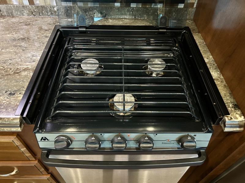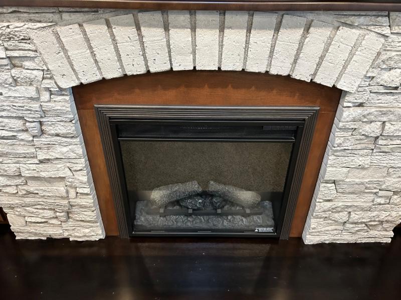 Stepping up the stairs you will find the front living area which seats at least eight people plus plenty of floor space for more family and friends! There are two theater seats along the interior wall, a slide out tri-fold hide-a-bed sofa with ottoman, a second slide with a bi-fold hide-a-bed sofa, and a full wall entertainment center with a TV and Ledgestone surround fireplace and cabinets. This space will become the main hangout during the big games or rainy days.