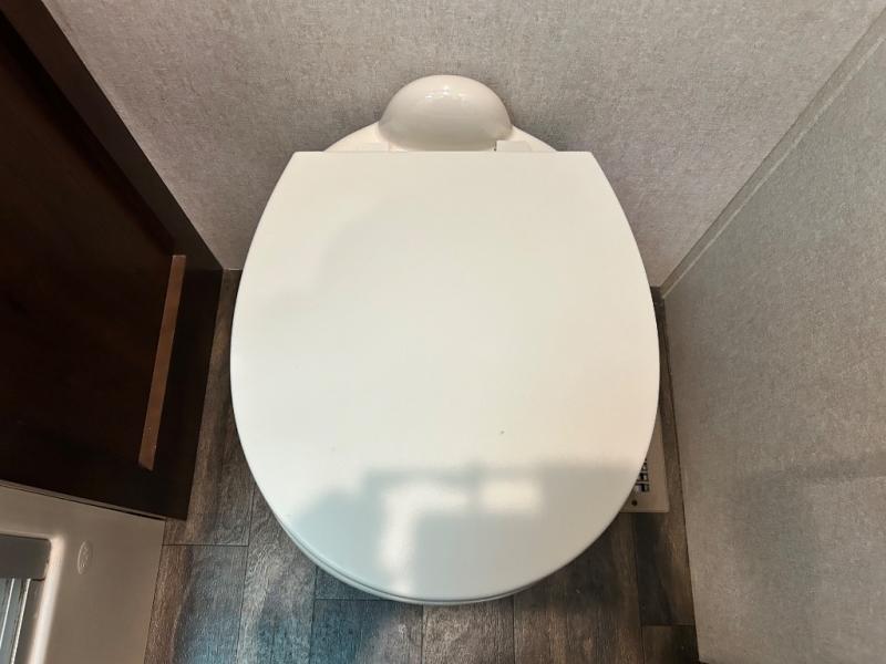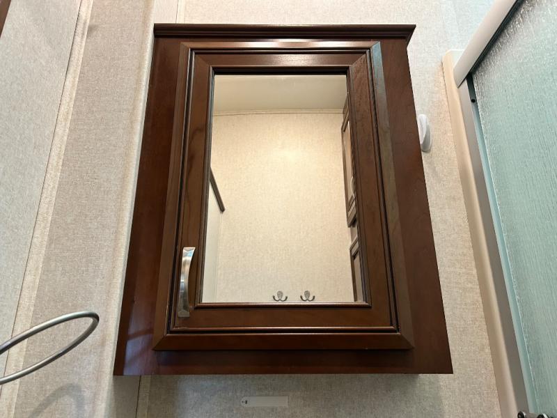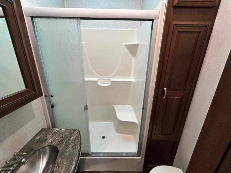 Heading towards the rear, the bathroom is before the bedroom. There is a shower with a seat, sink, medicine cabinet, linen storage, and a toilet.
