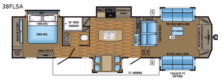 The opposite side of the kitchen has a slide out with a three burner range, microwave, and a residential refrigerator, or you can choose an optional 18 cu. ft. refrigerator. Next to the slide you will find a pantry which is ideal for storing your dry goods. The kitchen island provides extra counter space and a double kitchen sink.