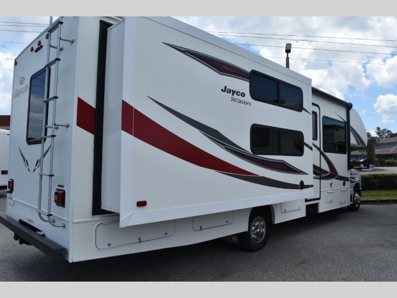 A set of bunk beds, double slide outs, and a front cab bunk are some of the features that you will love about the 31XL Redhawk class C motor home by Jayco.