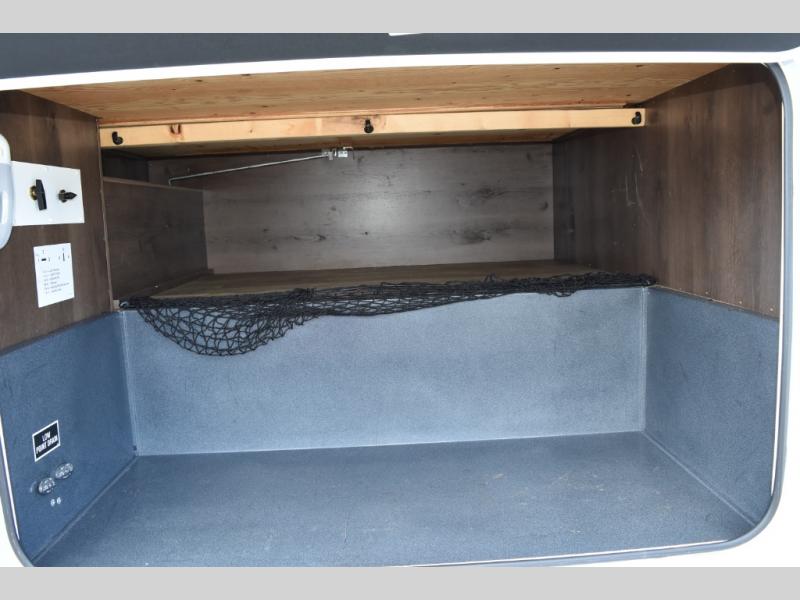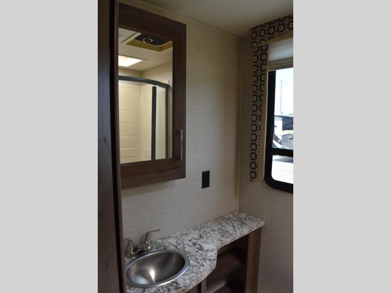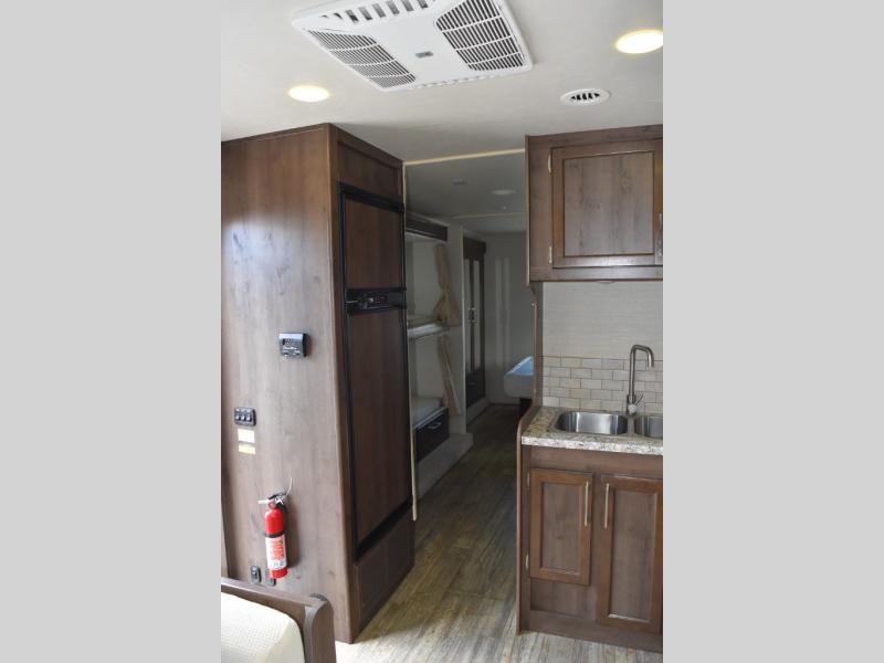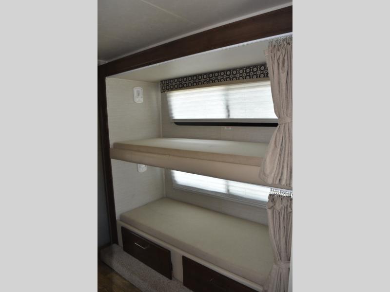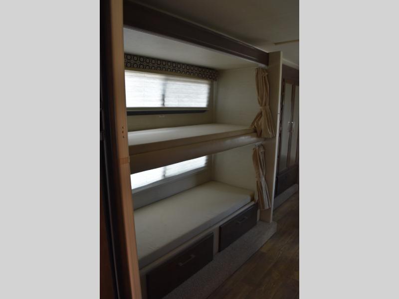 Across from the bathroom there is a slide out with a set of bunk beds which your kids will love! Continuing along the slide and into the bedroom you will find a wardrobe for your hang up clothes. The bedroom also features a queen bed, nightstands, and an overhead cabinet.