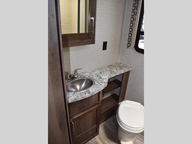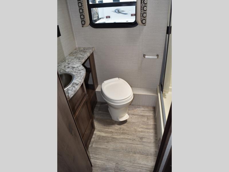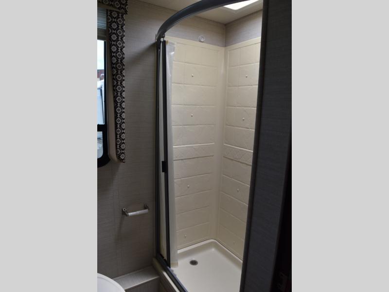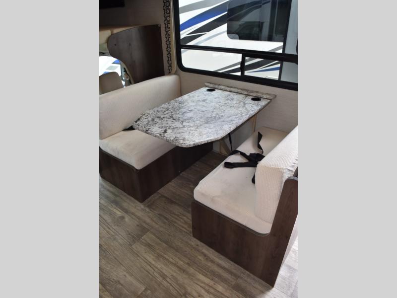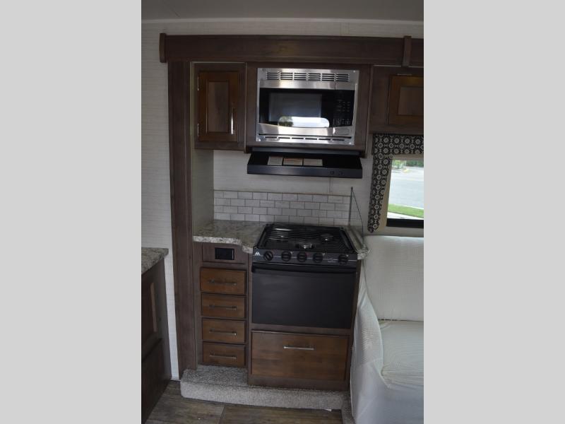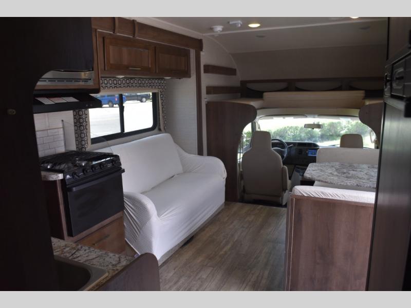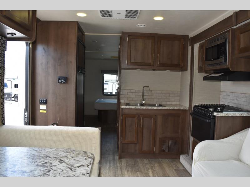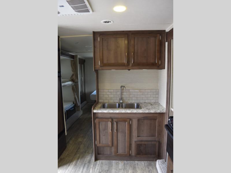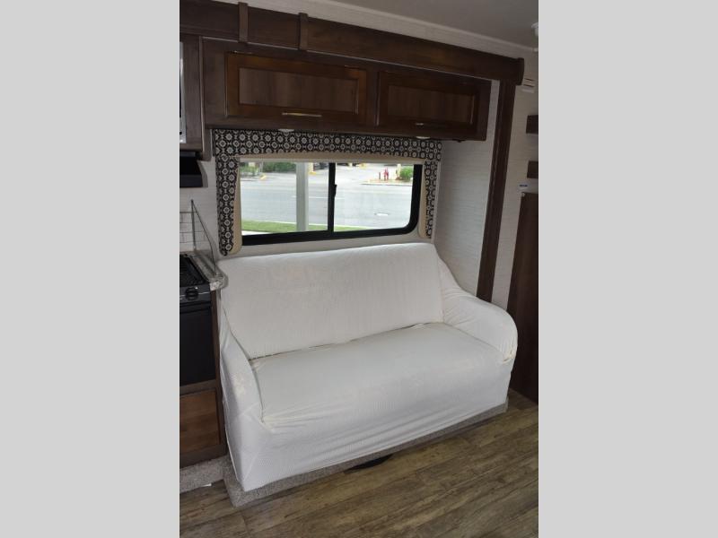 As you enter the motor home, to the right you can enjoy your meals around the dinette, the opposite side has a slide out with a sofa, microwave, three burner range, and overhead cabinet. You will also find adequate counter space and a double kitchen sink. To the left of the entry door there is an 8 cu. ft. refrigerator.