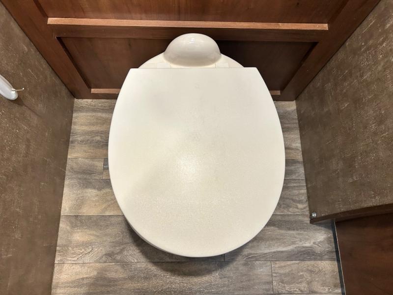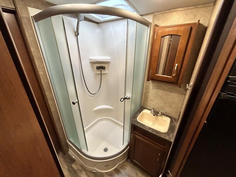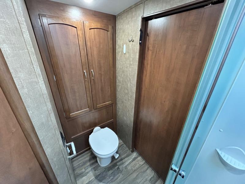 Heading towards the front of the trailer, you will find a walk-though bathroom. There is a toilet and linen cabinet on one side, and a sink, medicine cabinet, and radius shower on the other.