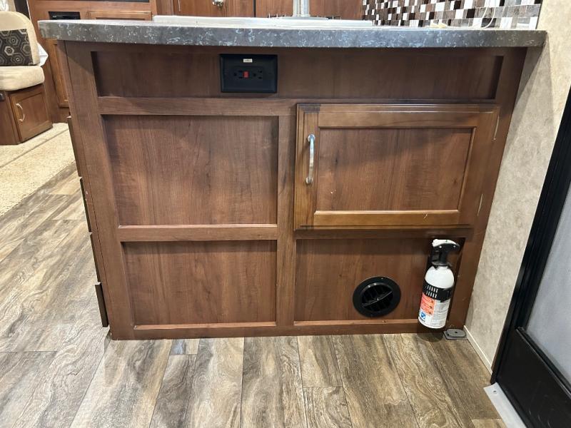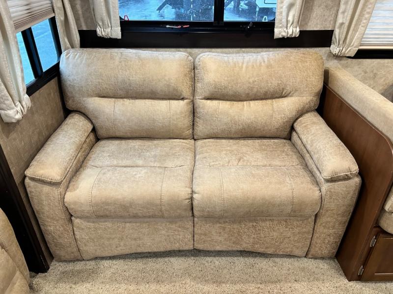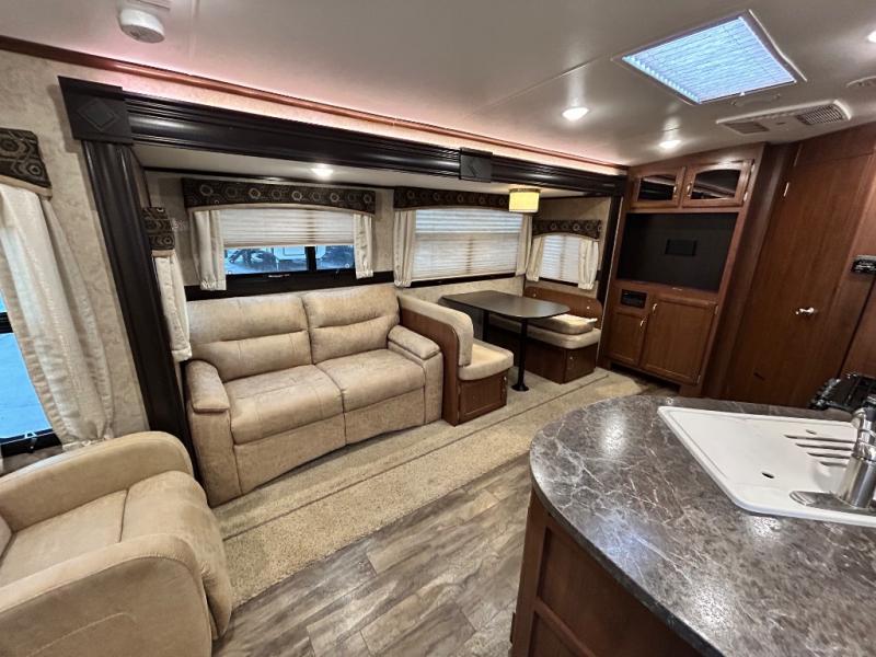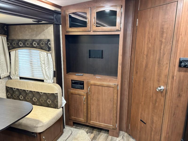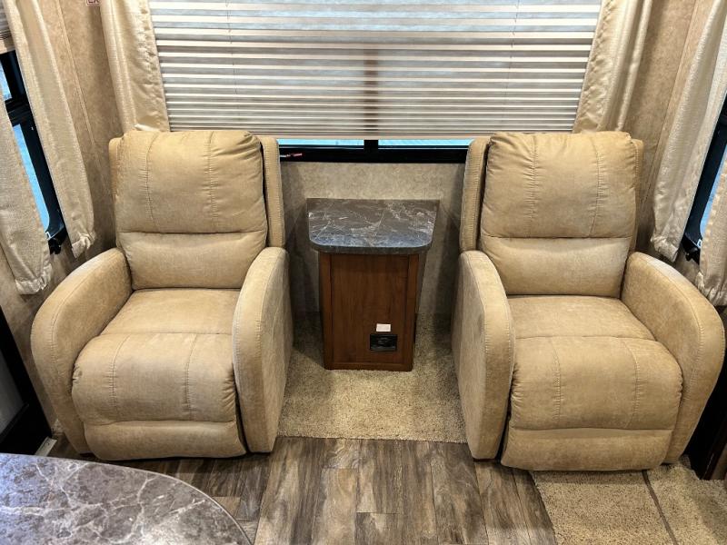 Stepping inside near the rear of the travel trailer, there are two lounge chairs and an end table. The road side slide has a hide-a-bed sofa and a booth dinette. Along the interior wall you will find the entertainment center.
