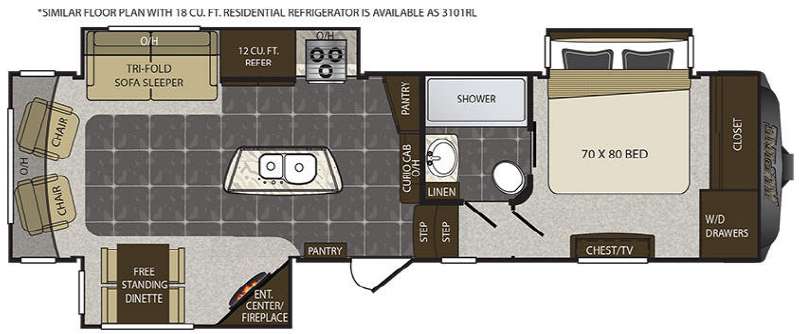 This rear living Alpine fifth wheel model 3101RL is very similar to the 3100RL featuring triple slides, a king size bed, and a convenient kitchen island. The main difference is that this Alpine features an 18 cu. ft. refrigerator instead of the 12 cu. ft. refrigerator found in the sister model.