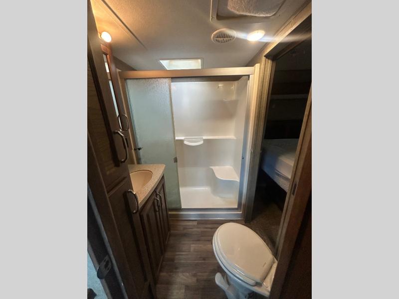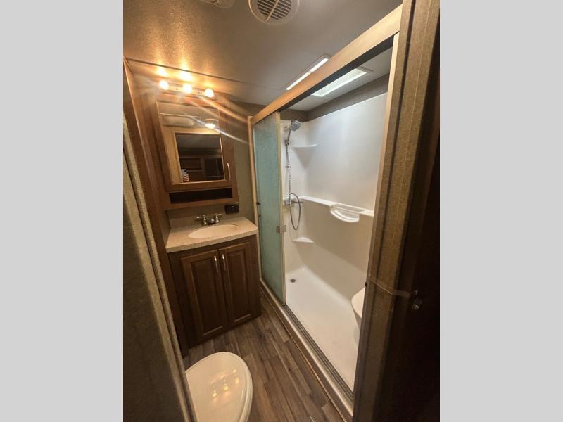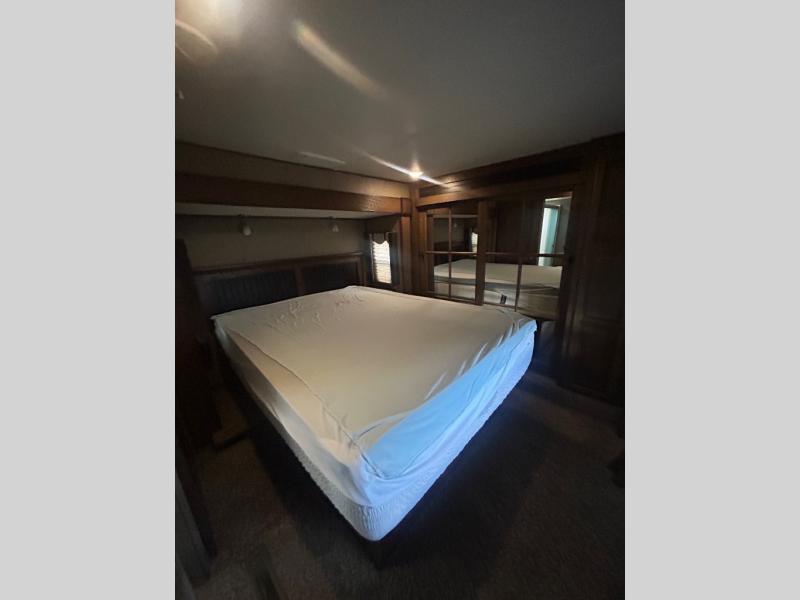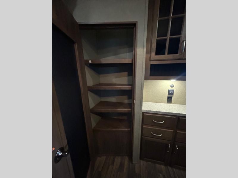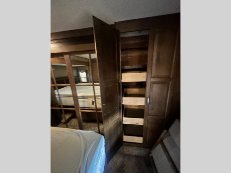 The private bedroom can be accessed from the hall or from inside the bathroom. Notice a chest of drawers with a space for a TV above along the curb side wall. There is a king bed slide out opposite which gives you added foot traffic space. The front wall offers more storage for your clothing with a large closet including sliding doors. There is also a second closet in the corner that has been prepped for a washer and dryer if you choose to add, that also features some drawer space, plus so much more!
