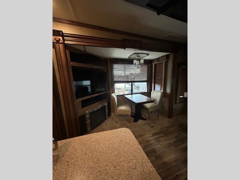 Just inside the door to your left there is a small pantry for more storage needs. Next, a slide out which features a corner entertainment center with fireplace and a free standing dinette with four chairs.