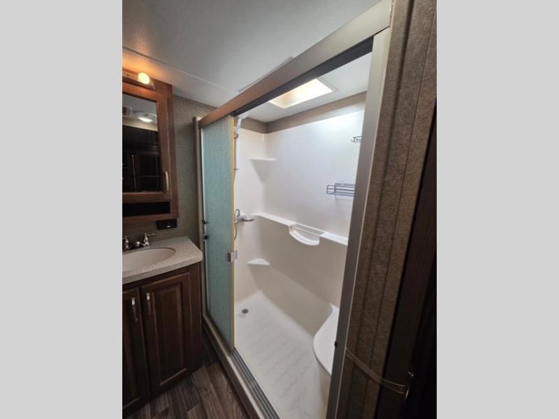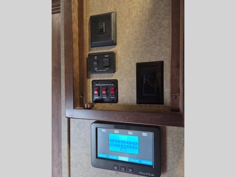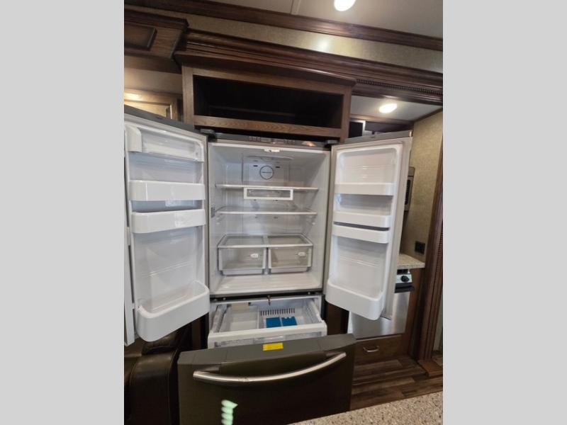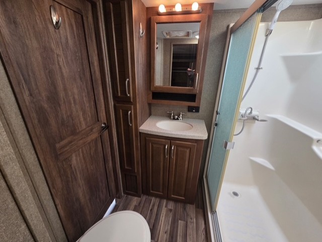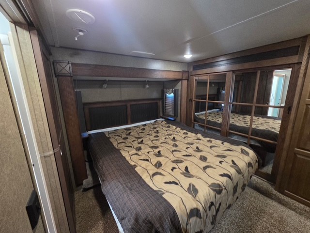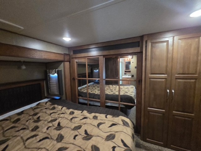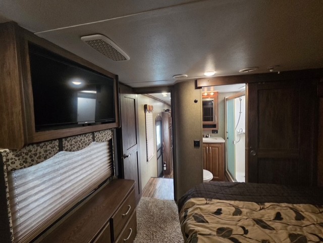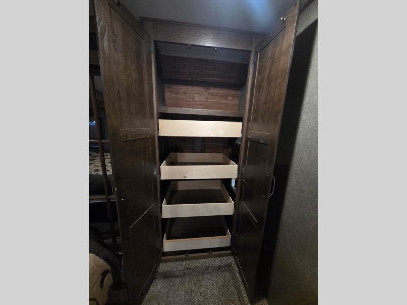 The private bedroom can be accessed from the hall or from inside the bathroom. Notice a chest of drawers with a space for a TV above along the curb side wall. There is a king bed slide out opposite which gives you added foot traffic space. The front wall offers more storage for your clothing with a large closet including sliding doors. There is also a second closet in the corner that has been prepped for a washer and dryer if you choose to add, that also features some drawer space, plus so much more!