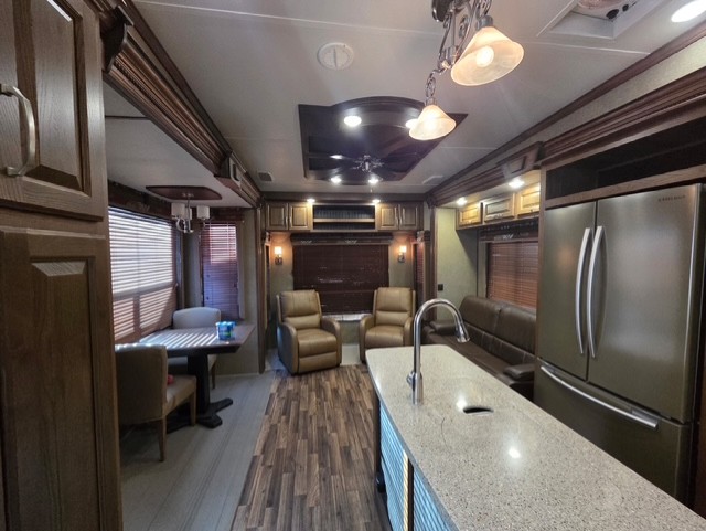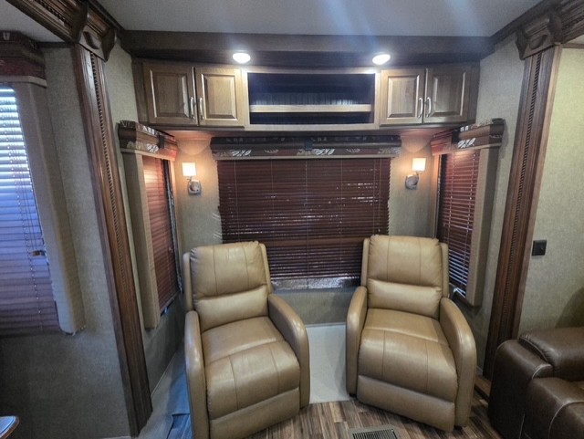 Along the rear wall of this Alpine unit enjoy more seating with two recliners and full width overhead cabinets to help keep things neatly tucked away and organized.