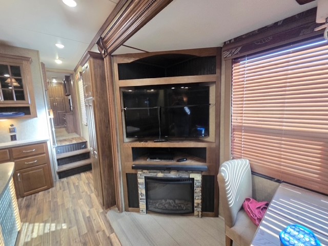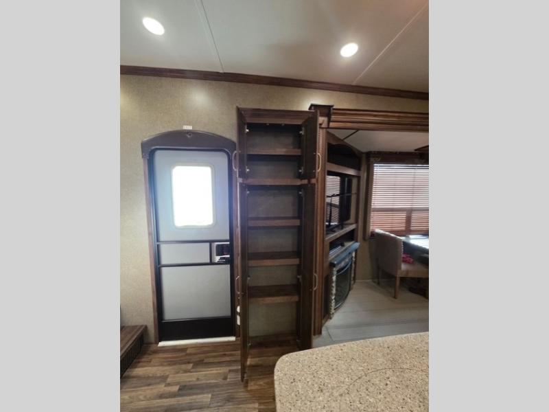 Just inside the door to your left there is a small pantry for more storage needs. Next, a slide out which features a corner entertainment center with fireplace and a free standing dinette with four chairs.